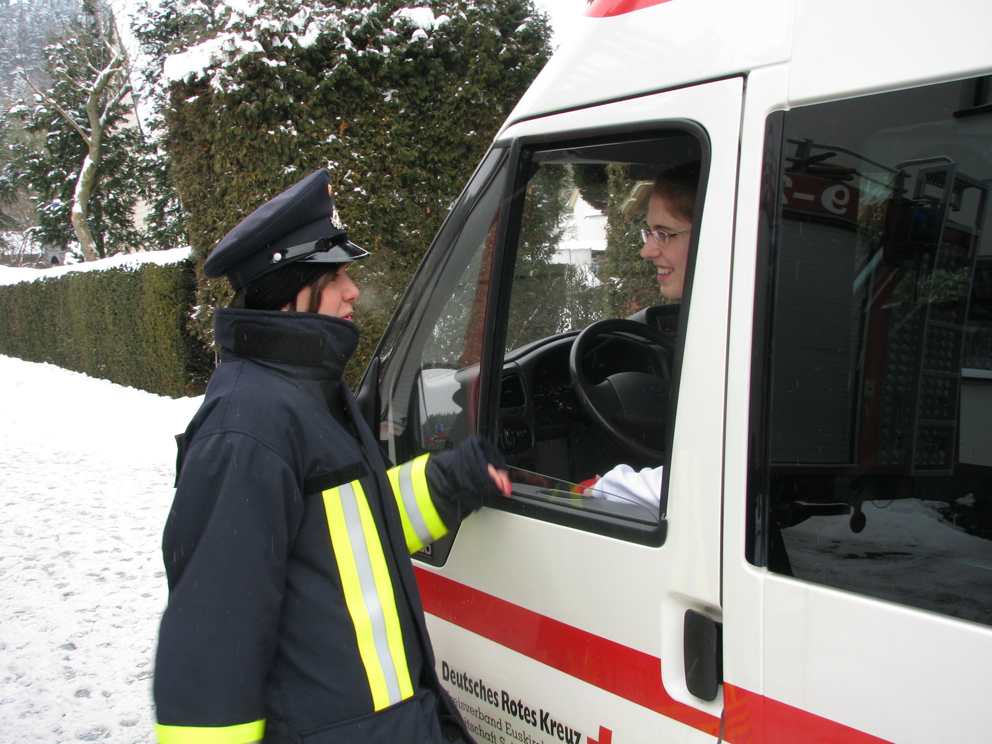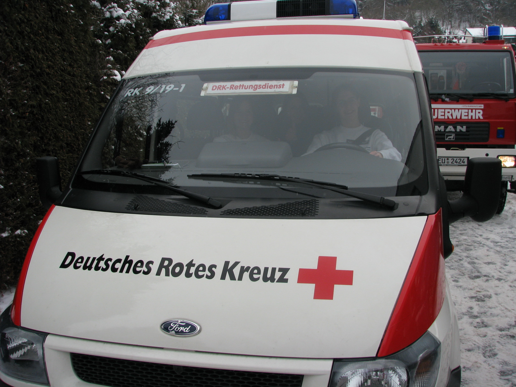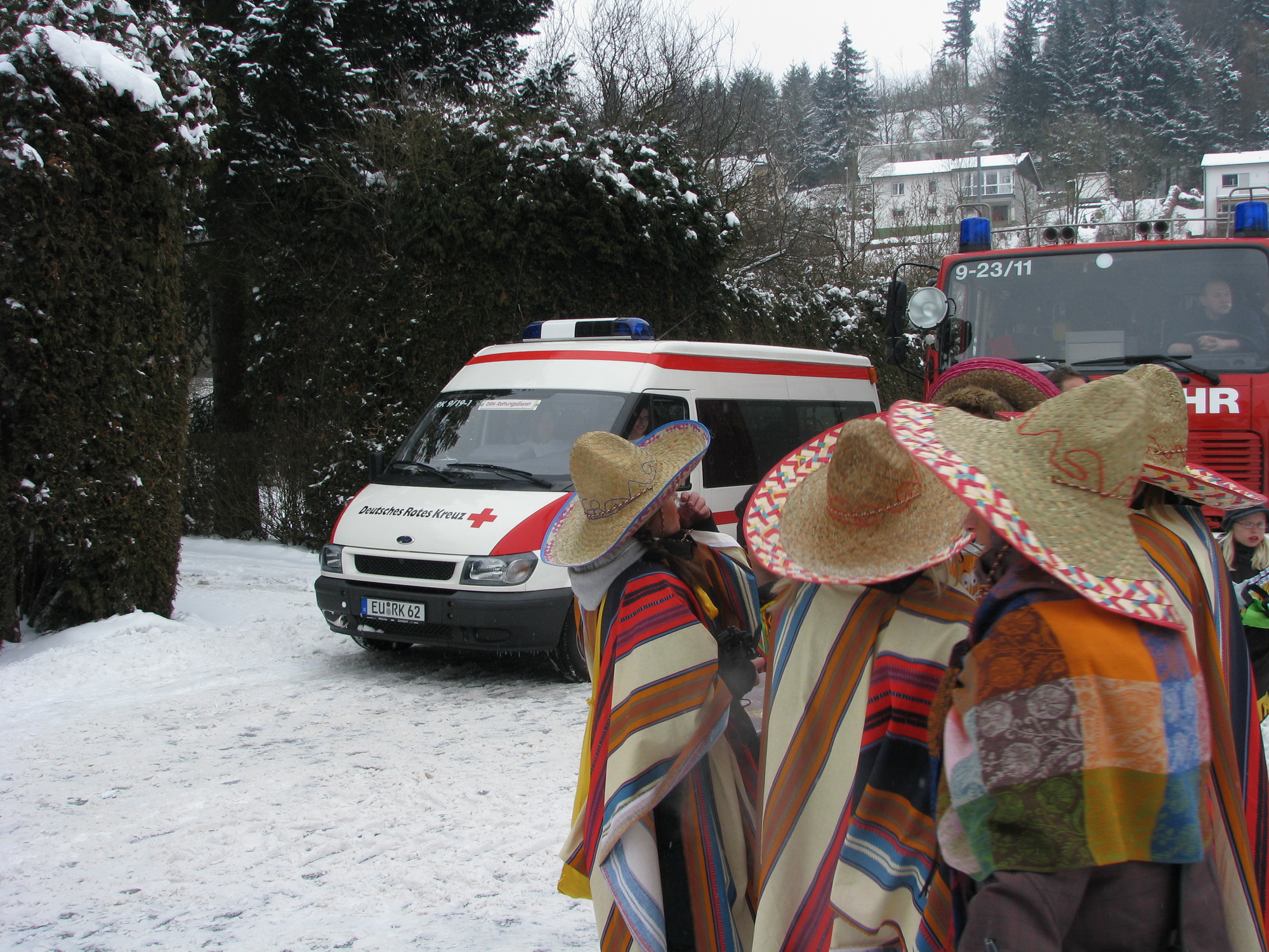 Damit das Karnevalstreiben nicht etwa in einem Fiasko enden kann, ist das Deutsche Rote Kreuz bei den Veranstaltungen der jecken Tage stets vor Ort. Auf den schneebedeckten Straßen Schleidens kam der neue Mannschaftstransportwagen (MTW) der Bereitschaft Schleiden zum Einsatz.