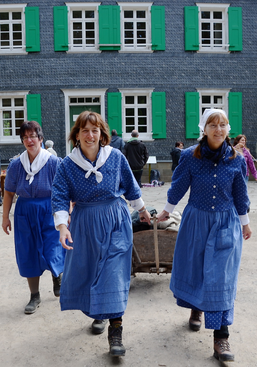So konnten die Besucher des Freilichtmuseums lernen, wie man früher Garben band und aufstellte, sie konnten „Kappes“ stampfen, Sensen dengeln und bei der Gewinnung von Leinen aus der Flachspflanze mithelfen. Es wurde aber auch viel dörfliches Handwerk wie Dacheindeckung mit Reed, das Beschlagen der Arbeitspferde, der Mühlenbetrieb oder Korbflechten demonstriert. Auch die vierbeinigen Helfer, ohne die alles noch viel mühseliger gewesen wäre, kamen zu Ehren: schwere Kaltblut-Pferde und Zugochsen. Etwa 45 Rösser und Ochsen bildeten einen stattlichen Korso, der vom Pingsdorfer Tanzsaal zur Baugruppe „Niederrhein“ zog.
