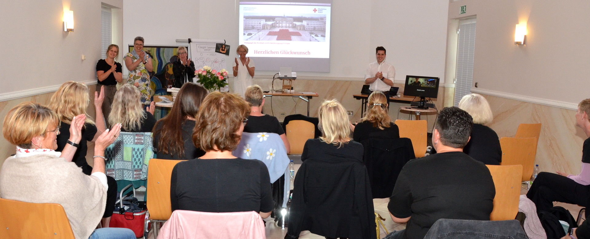 Heike Iven, die Leiterin der Rotkreuz-Familienbildung, Daniel Larres, der Leiter der Rotkreuz-Bildungsakademie des Kreisverbandes, und das restliche Orga-Team hatten das Qualifizierungskonzept im Vorfeld gemeinsam entwickelt. Zu Gast war am „Abschlusstag“ auch der Zuständige für die Kitas des Roten Kreuzes im Kreis, Ralf Krutwig, sowie Edeltraut Engelen, die sich weiterhin ehrenamtlich und mit Herzblut für das Rote Kreuz engagiert.