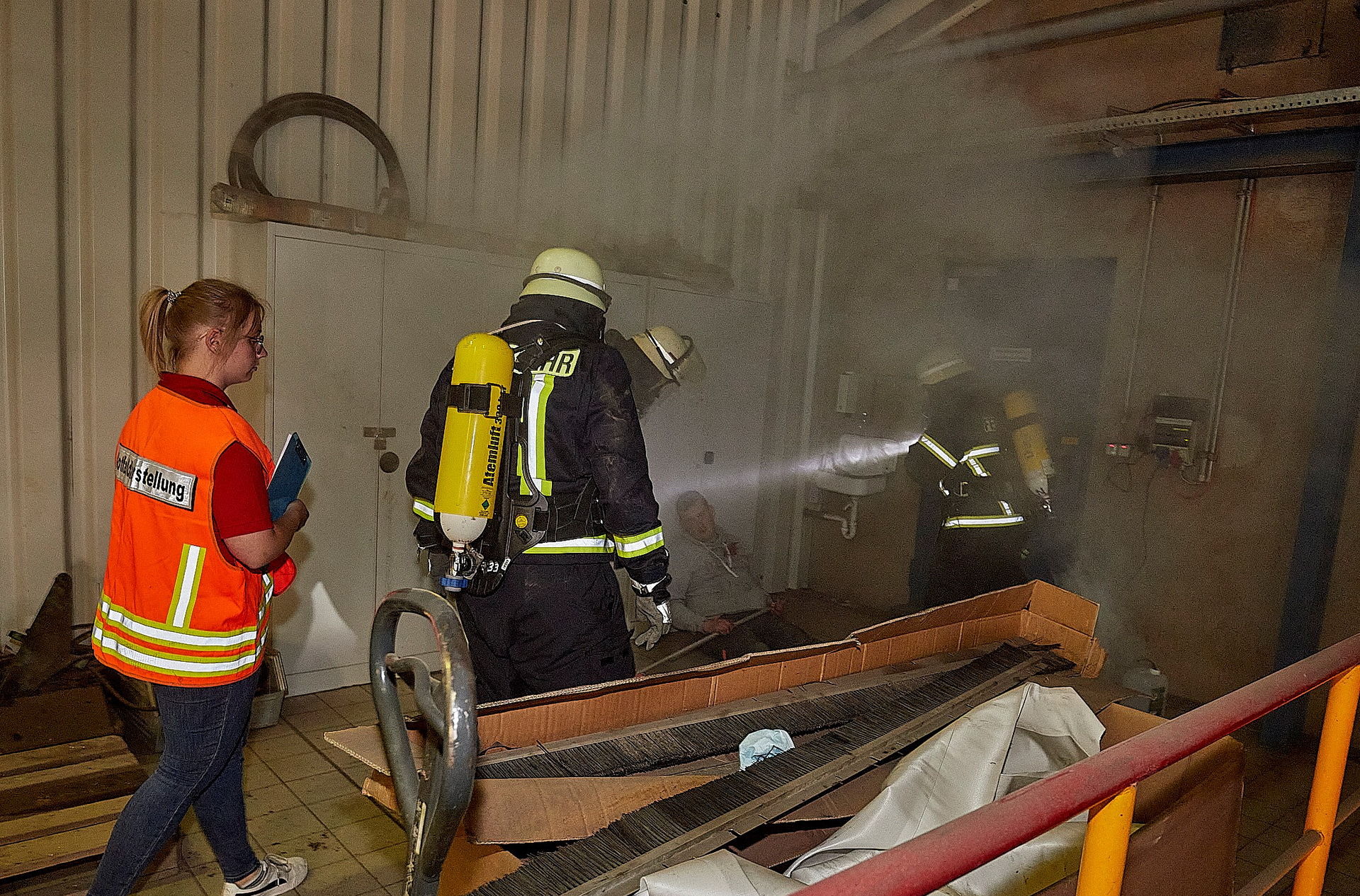 Das ist in Wirklichkeit natürlich nicht der Fall. Die Rettungskräfte haben zwar nicht auf Anhieb, aber recht bald alles unter Kontrolle. Immer mehr Feuerwehrleute dringen in die Halle vor und verschaffen sich einen Überblick. Überall liegen die gekonnt für die Übung zurechtgemachten „Opfer“. Auch das Verhalten von Patienten mit derartigen Verletzungen und Verbrennungen haben die Darsteller einstudiert.