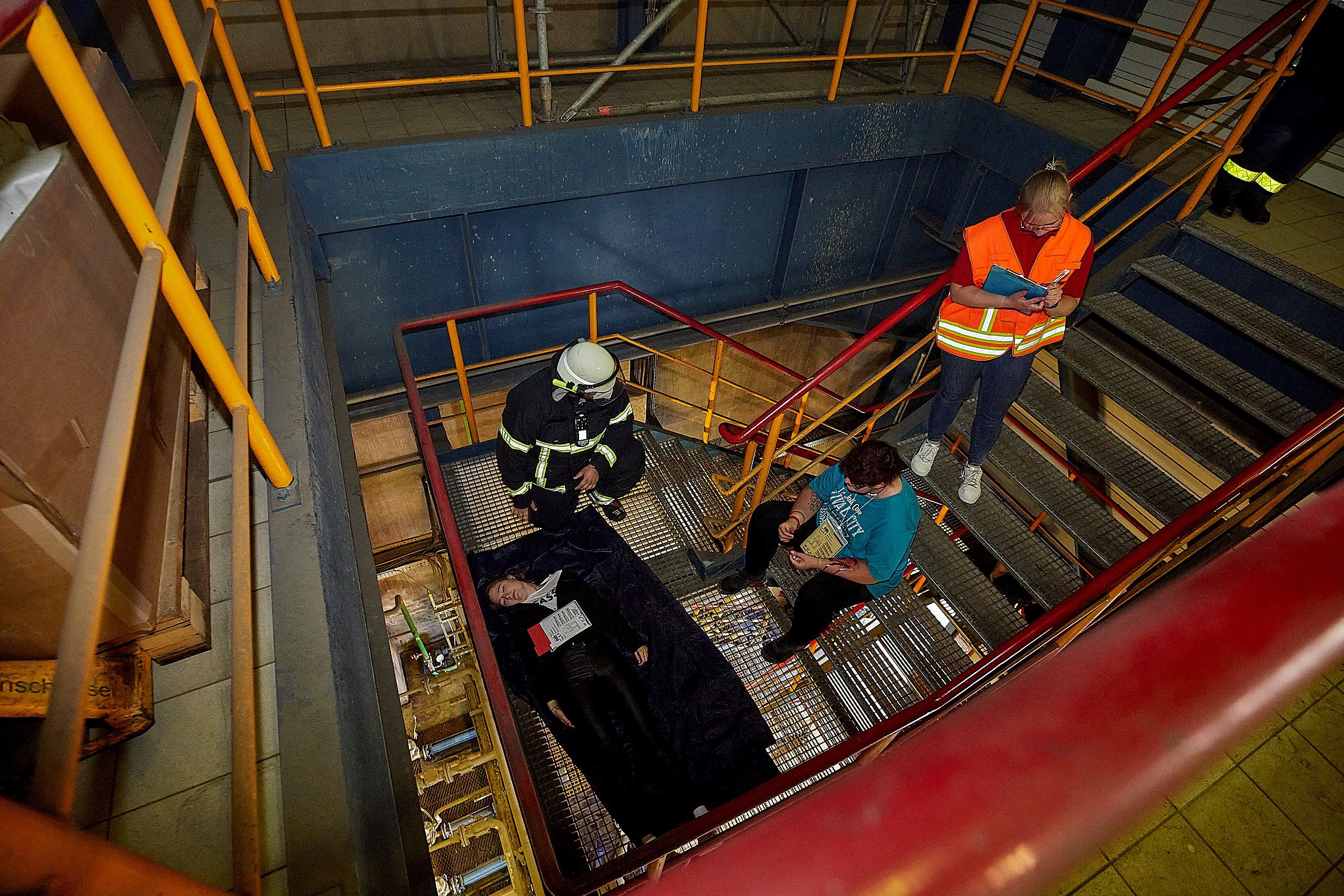 25 Verletztendarsteller waren über zwei Stockwerke verteilt worden. Während die 13 Darsteller im Untergeschoss schnell gefunden wurden, war auf der Metalltreppe und im Obergeschoss mehr Akribie erforderlich. „Das dauert aber“, stöhnt Burkhard Kühn. Neben einer beeindruckenden „Knochenverletzung“ an der Schulter ragt aus seinem Rücken ein Rohrende, das auf eine Lungenverletzung hindeutete.