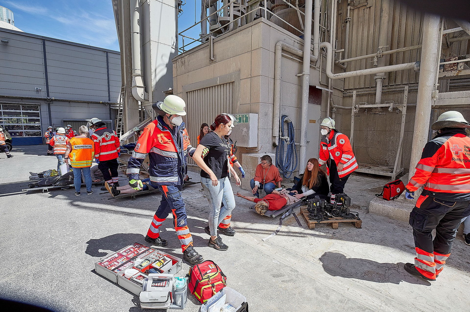 Damit die Einsatzkräfte nicht in einer echten Gefahrensituation überfordert werden, wird regelmäßig geübt – auch im großen Stil wie diesmal in der Zuckerfabrik mit 200 „Mann“, worunter sich natürlich auch Rot-Kreuz- und Feuerwehrfrauen befanden. „Es ist das erste Mal seit Corona, dass wir eine so große Übung fahren, erklärt Rainer Brück, Koordinierender Leiter Rettungsdienst im Kreis.