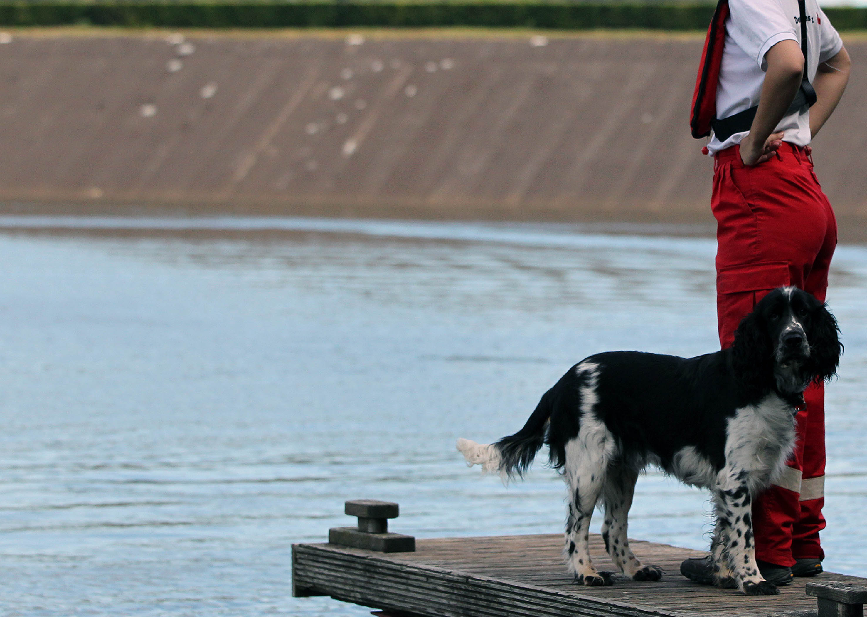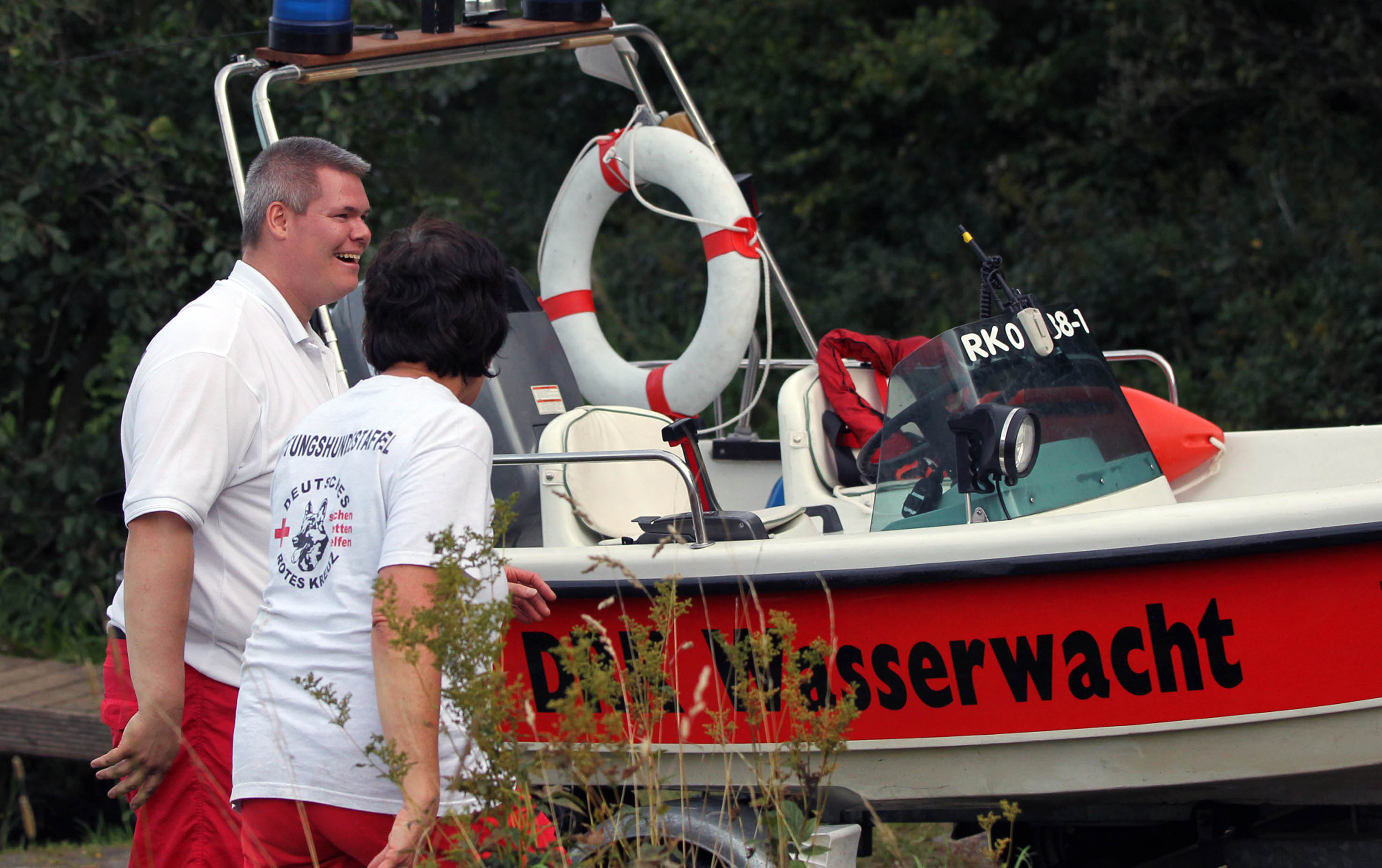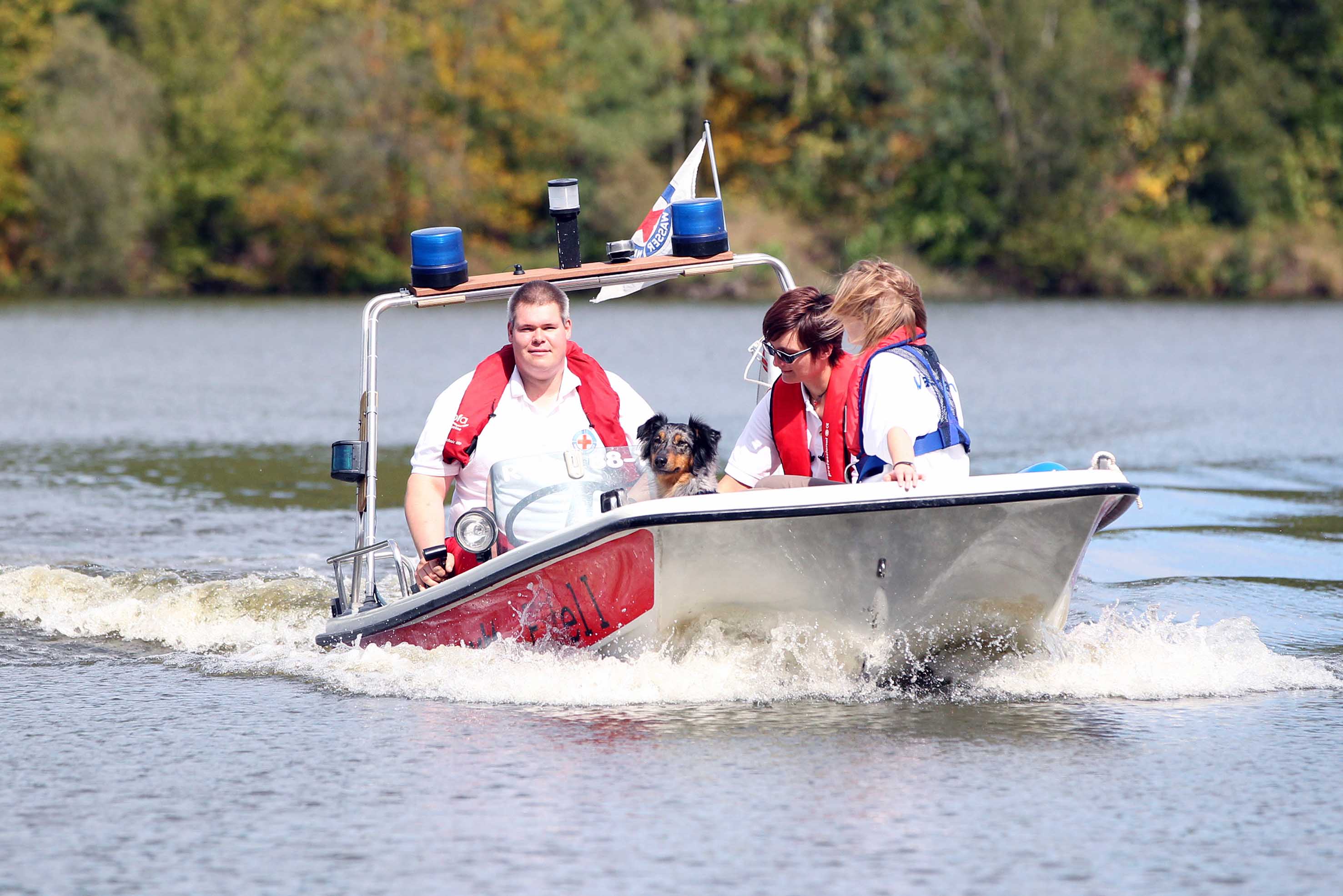 Kronenburger See – Eine nicht alltägliche Übungseinheit absolvierten die Rotkreuz-Rettungshunde des Kreises Euskirchen: Zusammen mit der Wasserwacht Kall übten die Hundeführer mit ihren geschulten Vierbeinern den Transport mit dem Rotkreuz-Rettungsboot „Eifel 1“ sowie im Anschluss das Ausbringen der Suchteams zu einer Gewässerrandsuche.