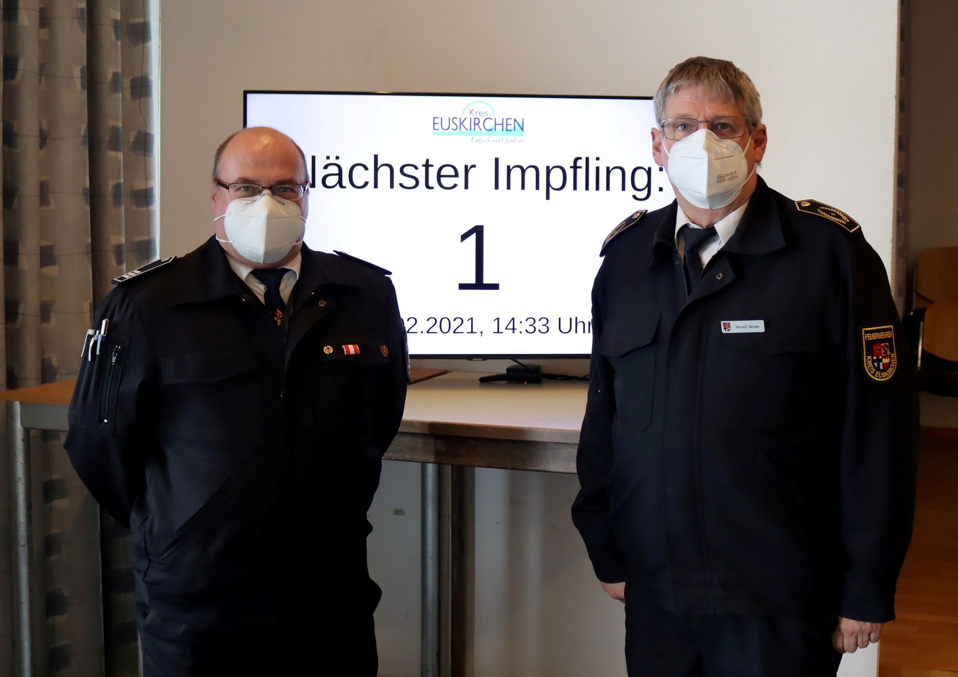 Der Mammutaufgabe der Corona-Impfungen stellt sich im Kreis Euskirchen eine ganze Gemeinschaft von Organisationen, darunter die Kassenärztliche Vereinigung, die Apotheken, die Kreisverwaltung, das THW, die Bundeswehr, der Malteser Hilfsdienst, die Feuerwehr, die DLRG und die Kreispolizei – und natürlich auch das Deutsche Rote Kreuz. „Mein Eindruck: Alle helfen mit großer Freude“, sagt Markus Ramers. Und auch Frank Gummelt ist voll des Lobes: „Das Team ist eins! Wir gemeinsam haben das Ziel, dass dieses Impfzentrum funktioniert.“