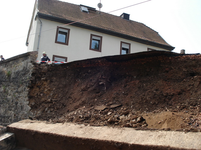 Das Gelände oberhalb der Mauer, eine Hofeinfahrt mit Garagen, drohte weiter einzustürzen. Um dieses zu verhindern, wurden Einsatzspezialisten des Technischen Hilfswerkes aus Euskirchen und Schleiden angefordert. Mittels speziellen Gerätes wurden Abstützmaßnahmen vorbereitet.