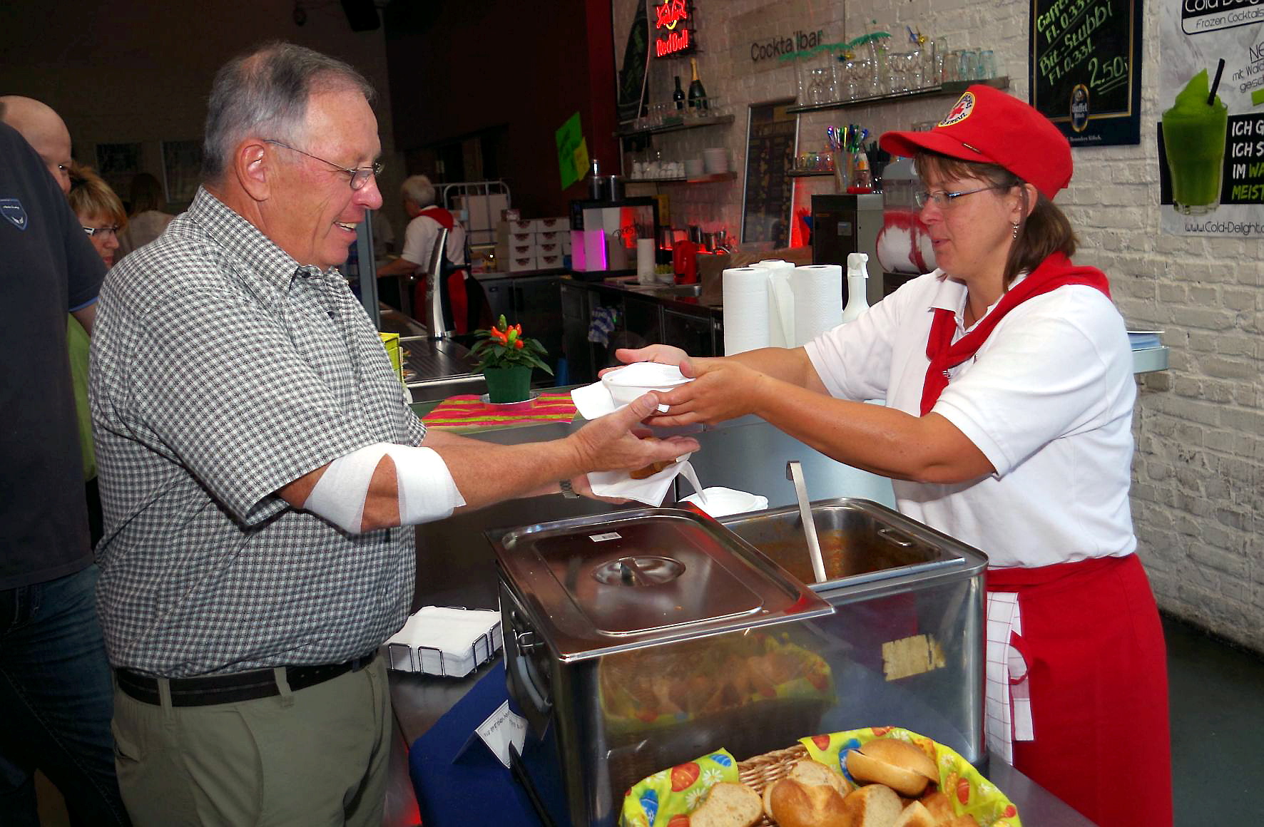 Um acht Uhr morgens ging es in der TON-Fabrik mit dem Aufbau los. Rund 80 Helfer des Rotkreuz-Kreisverbandes sowie etwa 30 Mitglieder des Blutspendedienstes West sorgten für einen reibungslosen Ablauf der Veranstaltung. Dazu zählte auch das Büfett, das die Ehrenamtler vorbereitet hatten. Denn nach der Blutspende galt ist nicht nur, sich zunächst einmal auszuruhen, sondern auch zu neuen Kräften zu kommen. Die Helfer hatten sich viel Mühe gegeben und Gulaschsuppe, Rührei sowie frischen Reibekuchen gekocht beziehungsweise gebacken.