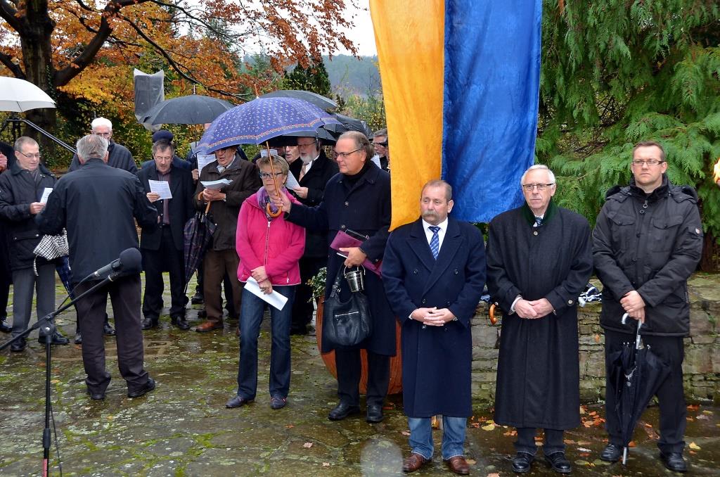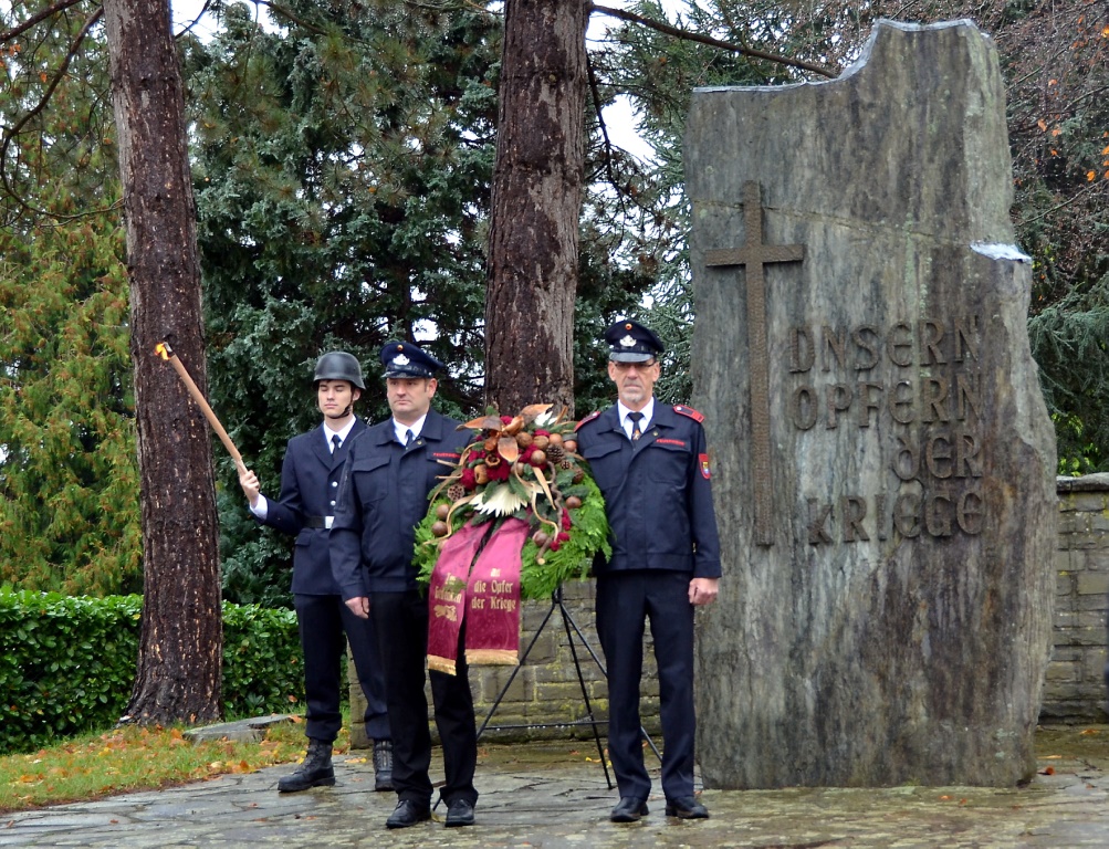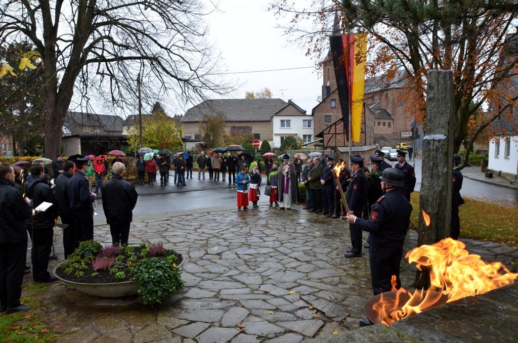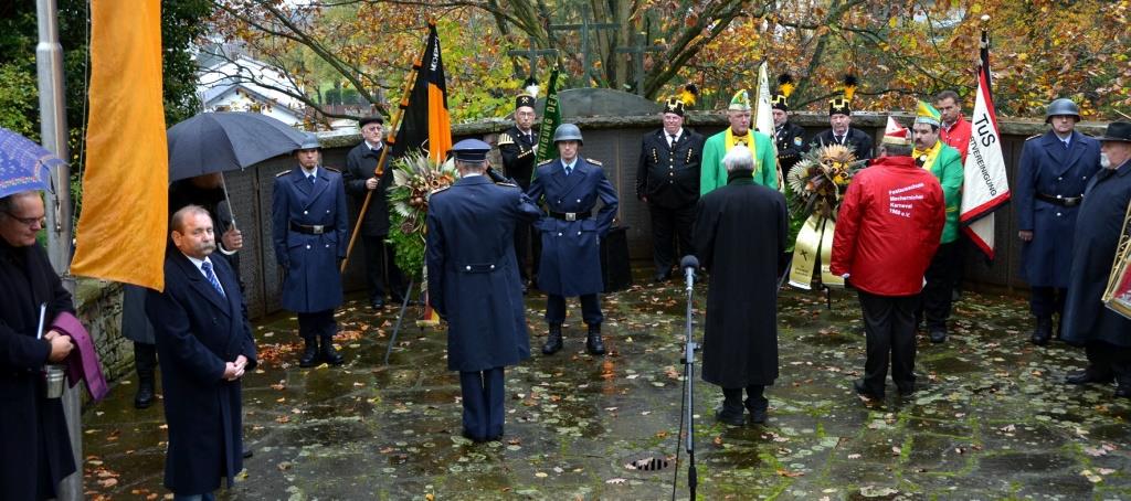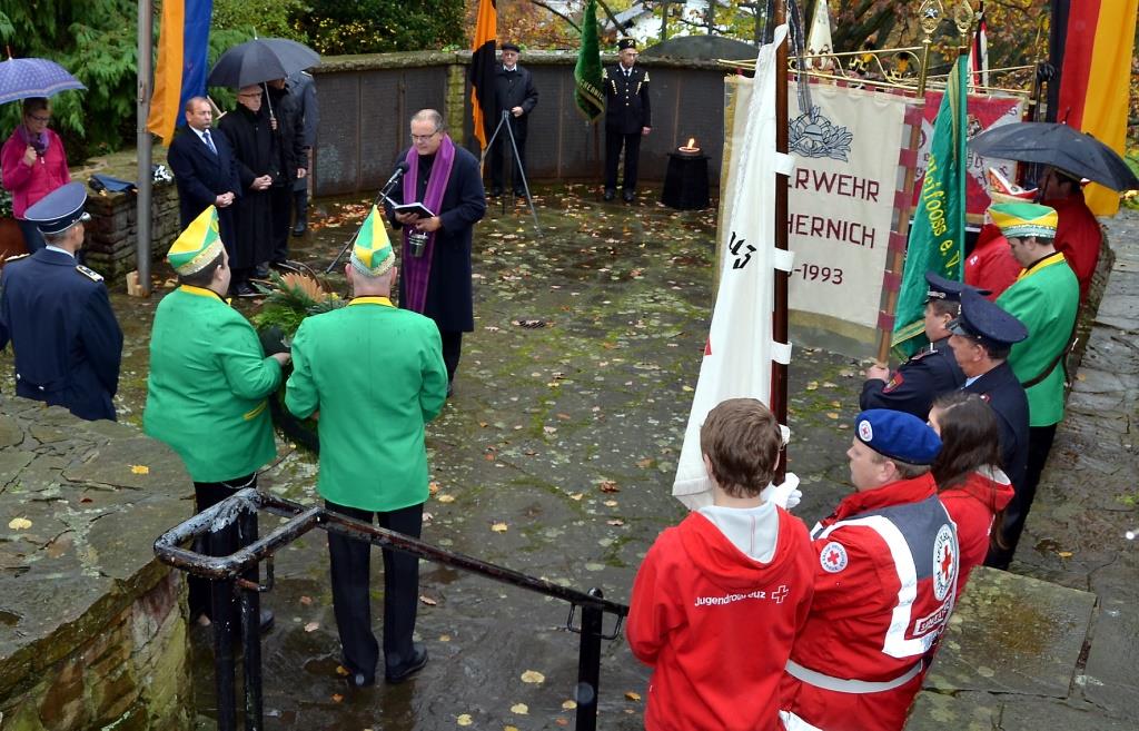Die Stadt Mechernich wurde von den beiden Vize-Bürgermeistern Peter Wassong und Wolfgang Weilerswist sowie dem stellvertretenden Verwaltungschef Thomas Hambach gleich dreifach vertreten. Eifeldekan Erik Pühringer segnete das Ehrenmal mit den Namen der Mechernicher Kriegstoten im Ersten und Zweiten Weltkrieg, Oberstleutnant Dietmar Brüders, der Standortälteste der Streitkräfte in Mechernich, und Vize-Bürgermeister Peter Wassong legten parallel zwei Kränze nieder.