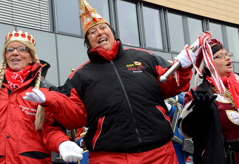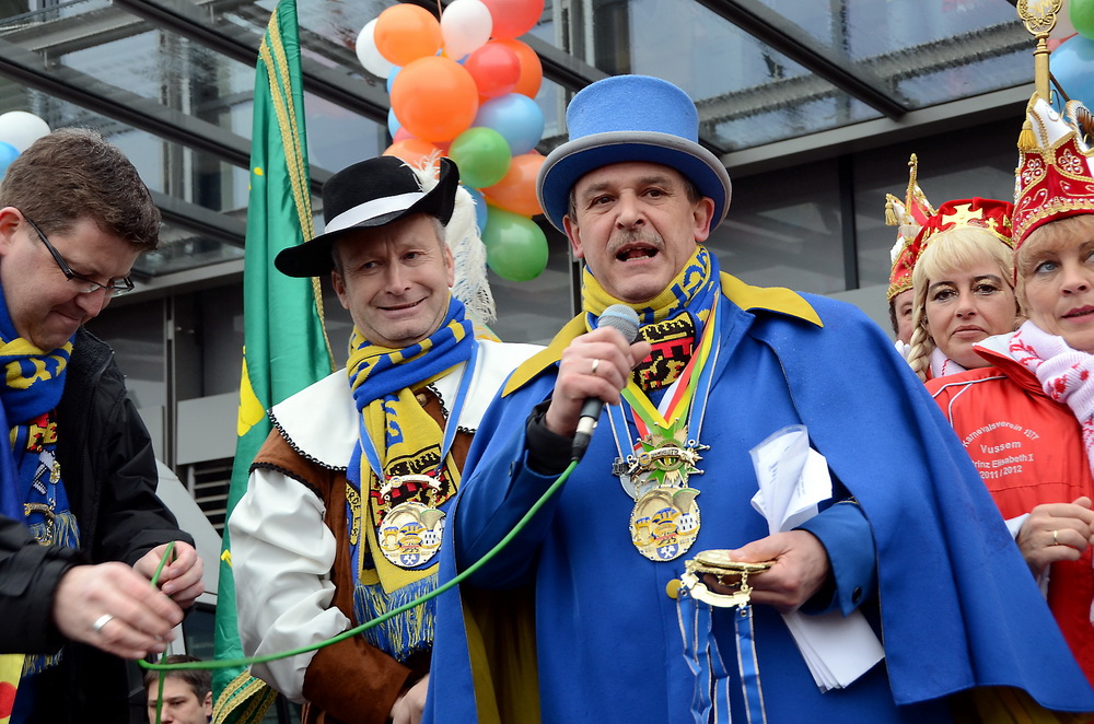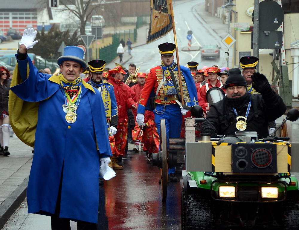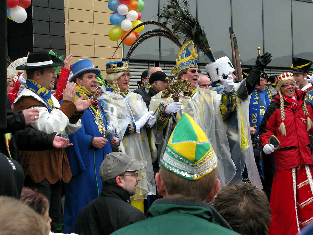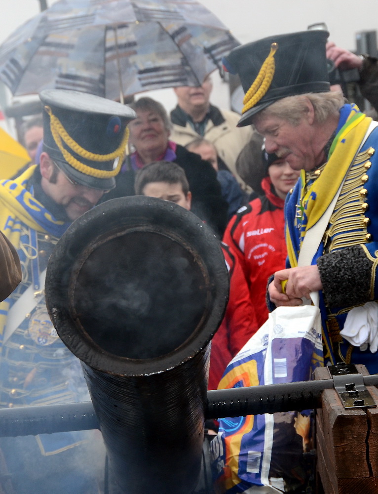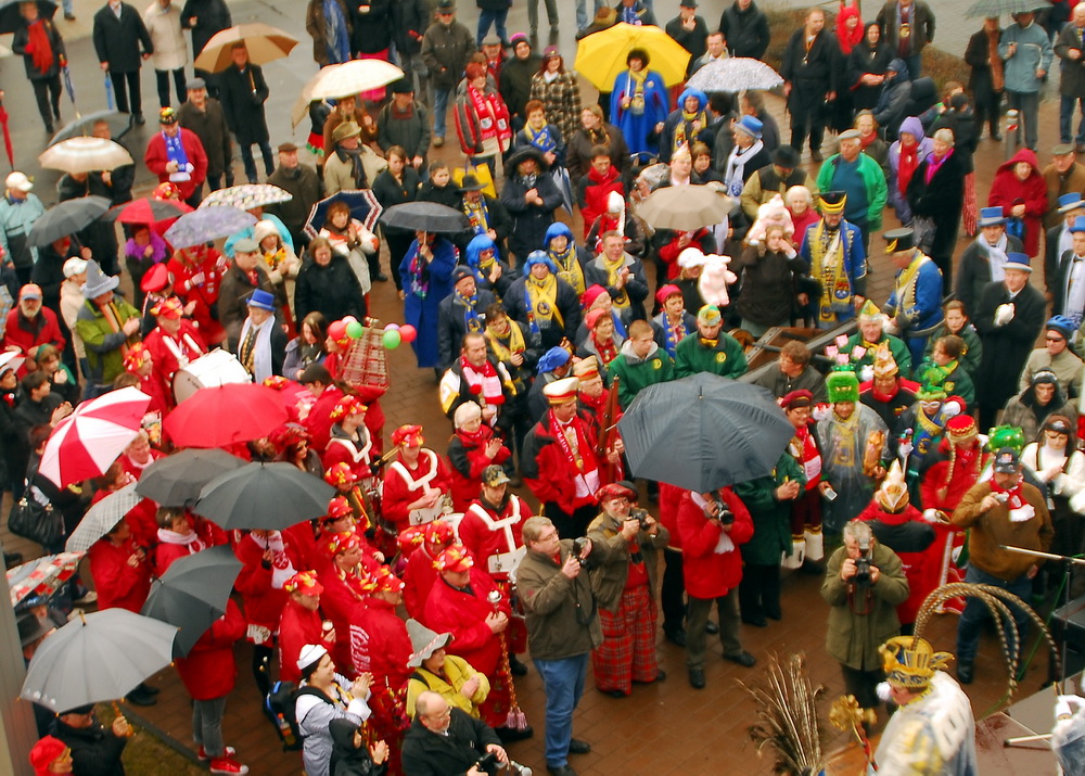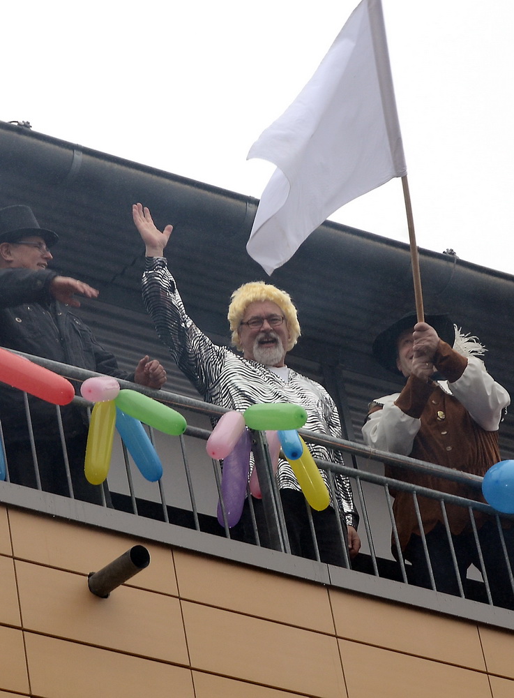 Das war die Höhe, und es kam, wie es kommen musste: Nach ein paar Knallern aus der Kanone der Rathausstürmer schwenkte Schick plötzlich unter den Jubelrufen der versammelten Narren doch noch die weiße Fahne. Auf der Bühne tat er dann seine Abdankung kund: „Jungfrau Volka, Bauer Theißen und der Prinz tut Hucky heißen, nun übernehmt ihr das Geschick, am Bleiberg herrscht Radau und Glück. Drum wird jetzt hier und ohne Zetern bis Aschermittwoch abgetreten.“