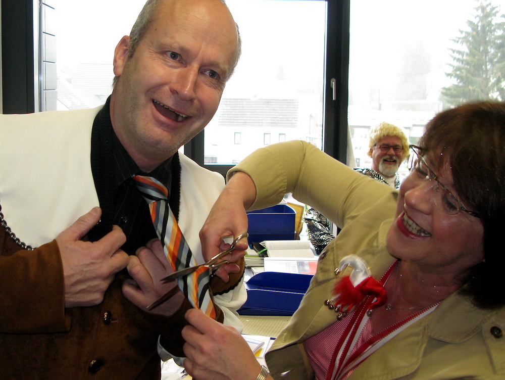 So schnell ließ sich das Stadtoberhaupt aber nicht den Schneid abkaufen. Mit gewaltigen Böllerschüssen vom Rathausbalkon machte Schick unmissverständlich klar, dass mit ihm an diesem Tag nicht gut Kirschen essen war. Kein Wunder: Schon am frühen Morgen hatte seine Sekretärin Martina de Vries ihm mit der Schere den Schlips stark eingekürzt – und der dabei anwesende Vize-Bürgermeister Robert Ohlerth hatte auch noch schallend dazu gelacht . . .
