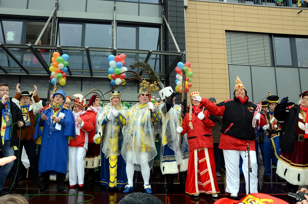 Traditionsgemäß legte der erste Bürger alle diesbezüglichen Befugnisse in die Hände des Dreigestirns. Das jecke Publikum auf dem dicht bevölkerten Rathausplatz jubelte, als Hans-Peter Schick seine Kapitulationserklärung verlas – und die Menge gleichzeitig zum Prosten und zu Alaaf- und Helau-Rufen hinriss. Nein, die 13 war auch bei Schicks 13. Abdankung an Weiberfastnacht keine Unglückszahl.