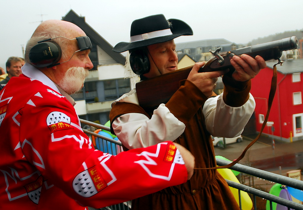 Angesichts des Gegenfeuers, das Schick nun vom Rathausbalkon auf die Feldartillerie der Prinzengarde eröffnete, hatte „Addy“ gleich mit Kennerblick Ernst Pingen von der Kommerner St.-Sebastianus-Schützenbruderschaft ausgemacht, der dem Bürgermeister vorsintflutliche Schießeisen anreichte. Folgerichtig „ätzte“ Sechtem in Richtung „Beamtenbunker“: „Schicks Söldner sind wieder im Einsatz – und dann auch noch aus Kommern.“
