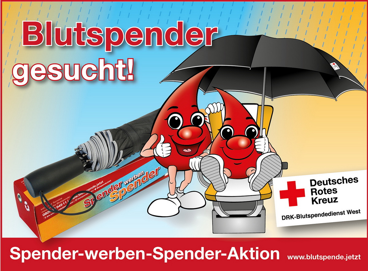 Aktuell gibt es beispielsweise eine „Blutspender-werben-Blutspender“-Aktion: Wer jetzt eine Freundin oder einen Kollegen mitbringt, der die Blutspende zum ersten Mal ausprobiert, bekommt direkt auf dem Termin einen schicken Regenschirm geschenkt.