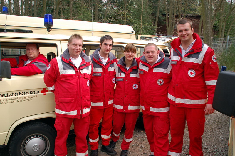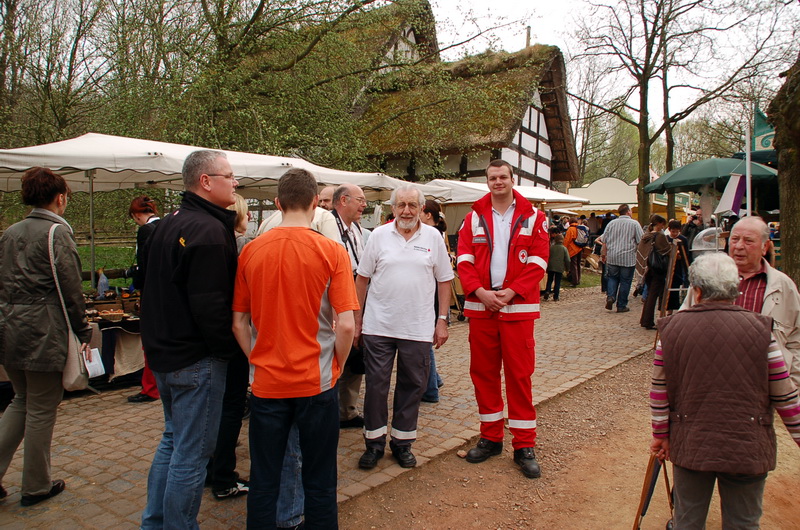 Inmitten des Jahrmarktes, am Pingsdorfer Tanzsaal, hatte das Rote Kreuz aus Mechernich seine Unfallhilfsstelle errichtet. Laufend patroullieren Rotkreuzler durch das Gelände, um im Notfall schnell helfen zu können.