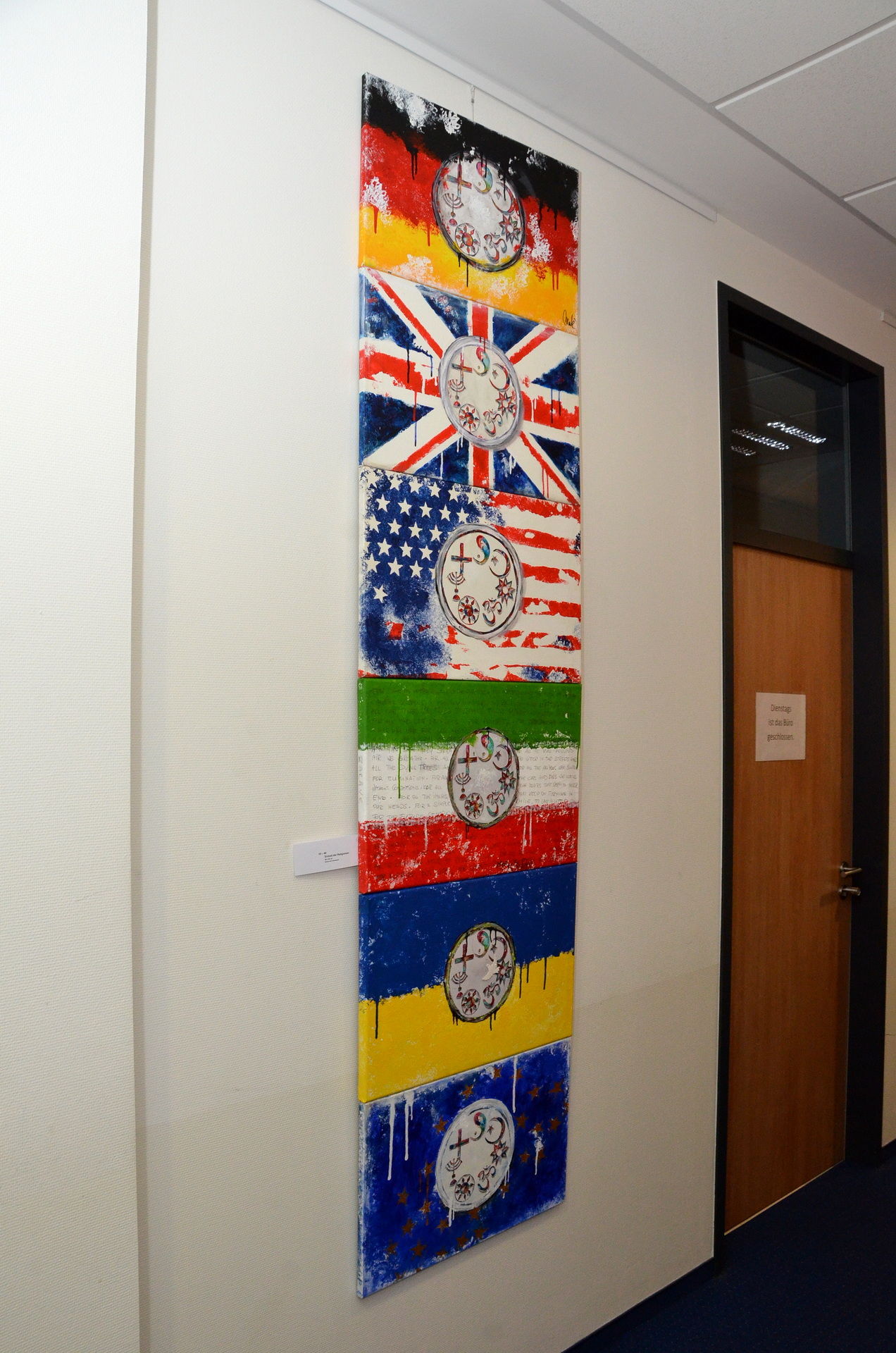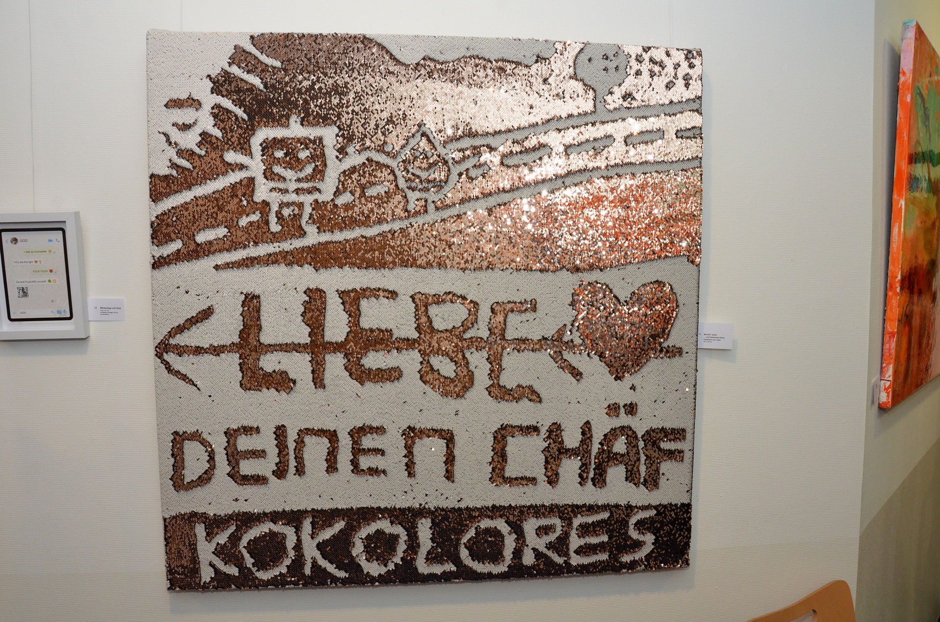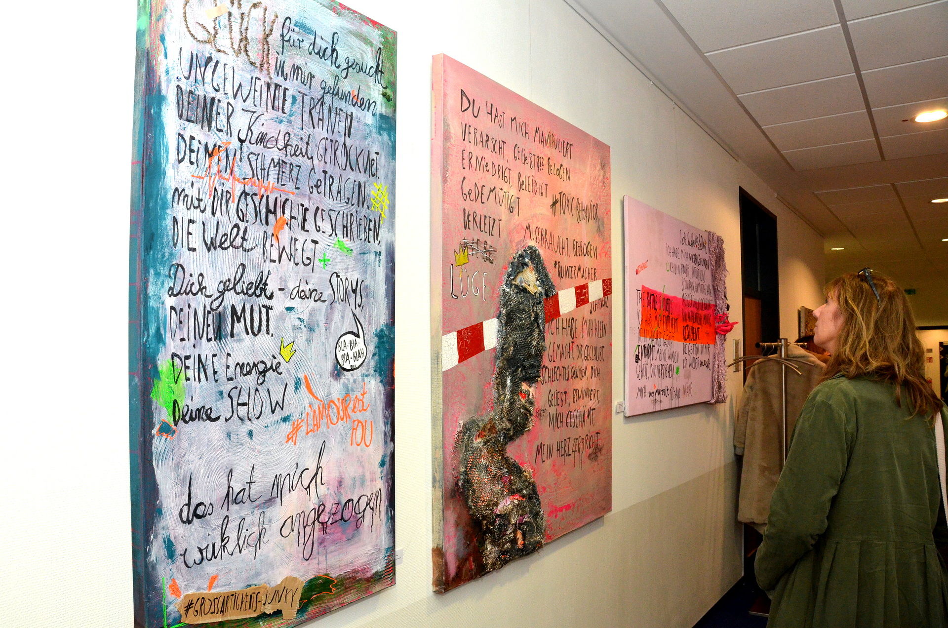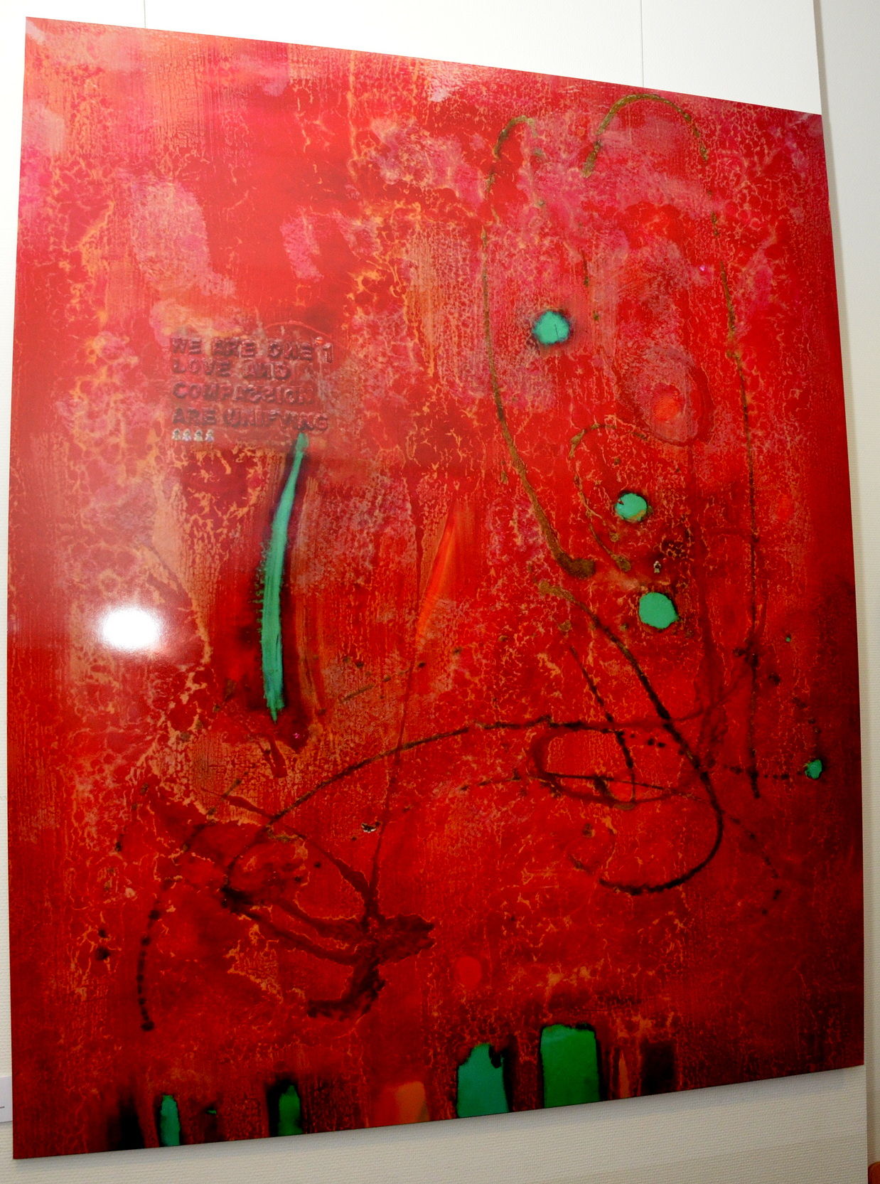 Die Künstlerin hat als ehemalige Journalistin auch Texte in ihren Bildern verarbeitet, um Botschaften besser auf den Punkt zu bringen. Das Titelbild der Ausstellung trägt den Namen „Love and companion are unifying“ („Liebe und Gemeinschaft vereinigen“). Dies steht auch darin geschrieben. Nicht zufällig ist das Bild in Rot gestaltet. Mack: „Das ist die Farbe des Feuers, der Lebensfreude, der Emotion und Lebensenergie.“