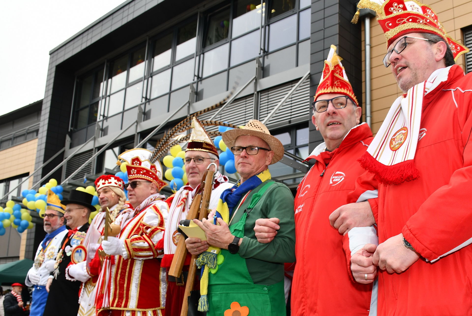 Klartext des Bürgermeister Dr. Hans-Peter Schick beim traditionellen „Sturm aufs Rathaus“ – Erster Beigeordneter Thomas Hambach schießt unfreiwillig die Lautsprecheranlage der angreifenden Karnevalisten ab – Dennoch setzten sich am Ende Charly Theißen, Ralf Schumann, Dreigestirn, Artillerie und Musikzug durch – Jecken bejubeln neue Fußballbundesliga am Bleiberg
