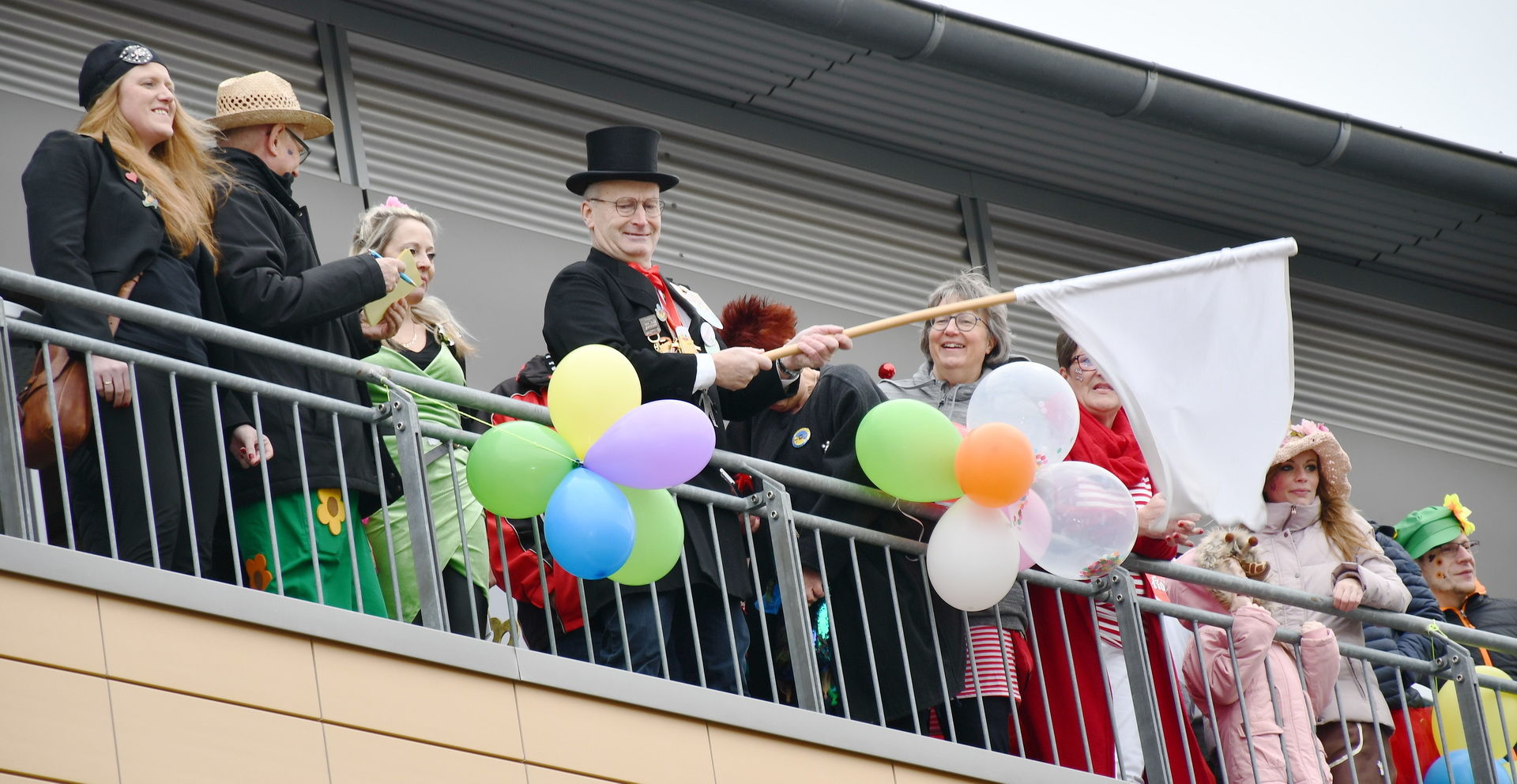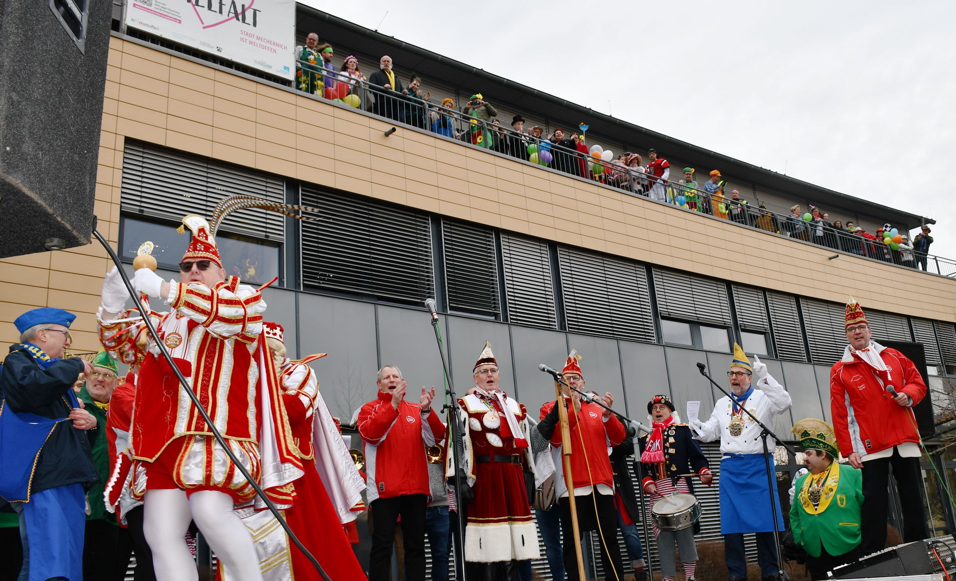 Bereits der dritte wassergefüllte Luftballon, den der Erste Beigeordnete und stellvertretende Verwaltungschef von der Rathausbrüstung auf die angreifenden Karnevalsjecken schleuderte, traf das Mischpult der Lautsprecheranlage und schaltete alle Mikrophone stumm. So erfuhren die närrischen Zaungäste nur noch rudimentär, was ihnen die von Karl „Charly“ Theißen (Prinzengarde Mechernich) und Ralf Schumann (KV Vussem von 1977) angefeuerten Fastelovends-Enthusiasten zu sagen hatten.