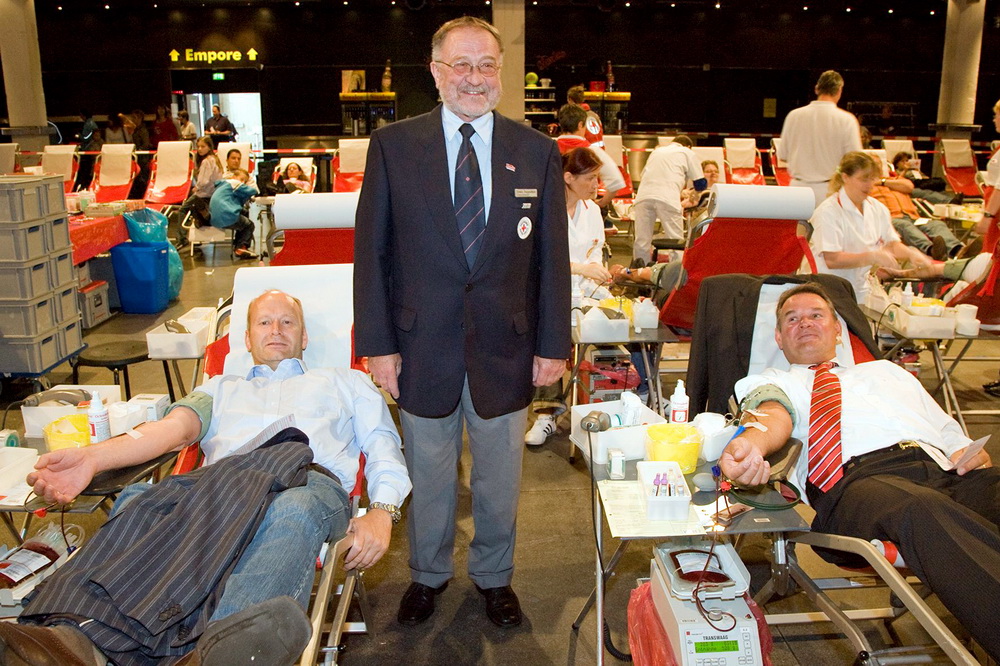 Bürgermeister Dr. Hans-Peter Schick unterstützt den Blutspendemarathon vom Start weg, ebenso wie Landrat Günter Rosenke und Johann Josef Wolf, der Begründer und Inhaber der Freizeit- und Kulturfabrik Zikkurat.