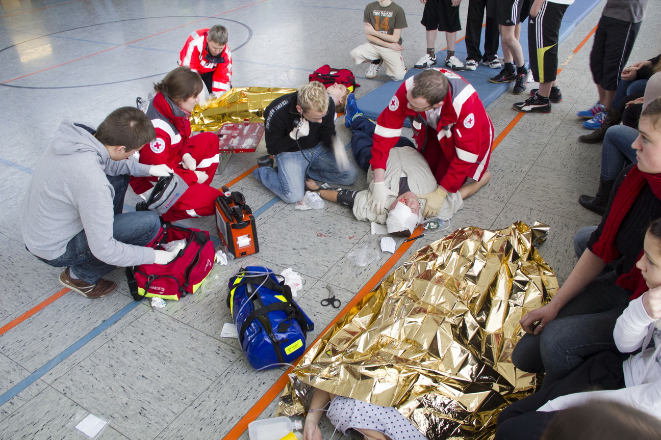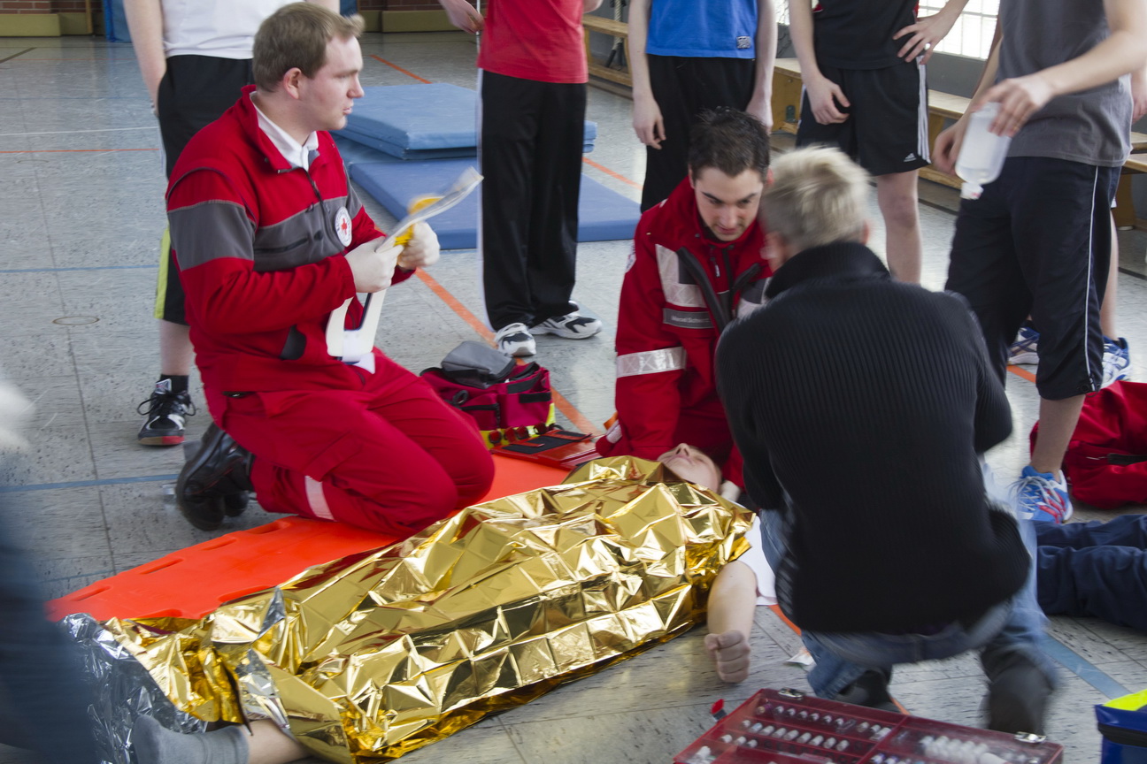 Vier Personen lagen scheinbar verletzt am Boden, fieberhaft arbeiteten die Schulsanitäter, um die mutmaßlichen Patienten zu versorgen.
