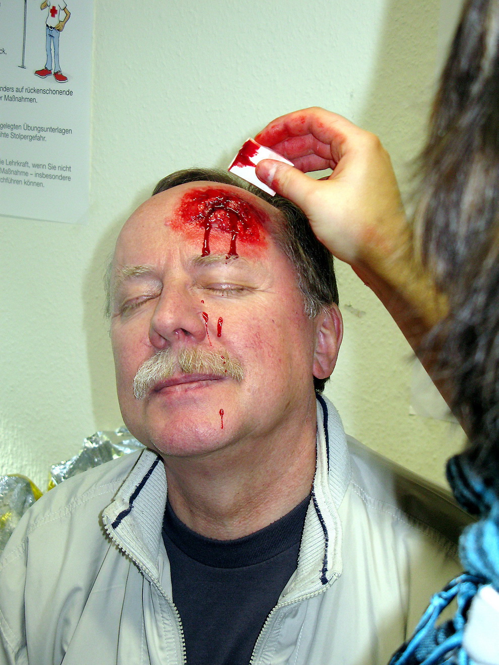 Dabei hatte vor allem Fritz Meyer, Lehrer für Sport und Englisch, besonders schlimm zu „leiden“. Zumindest sah die klaffende Platzwunde, die Rotkreuz-Mitarbeiterin Laura Zimmermann dem Pädagogen aufgeschminkt hatte, täuschend echt aus.