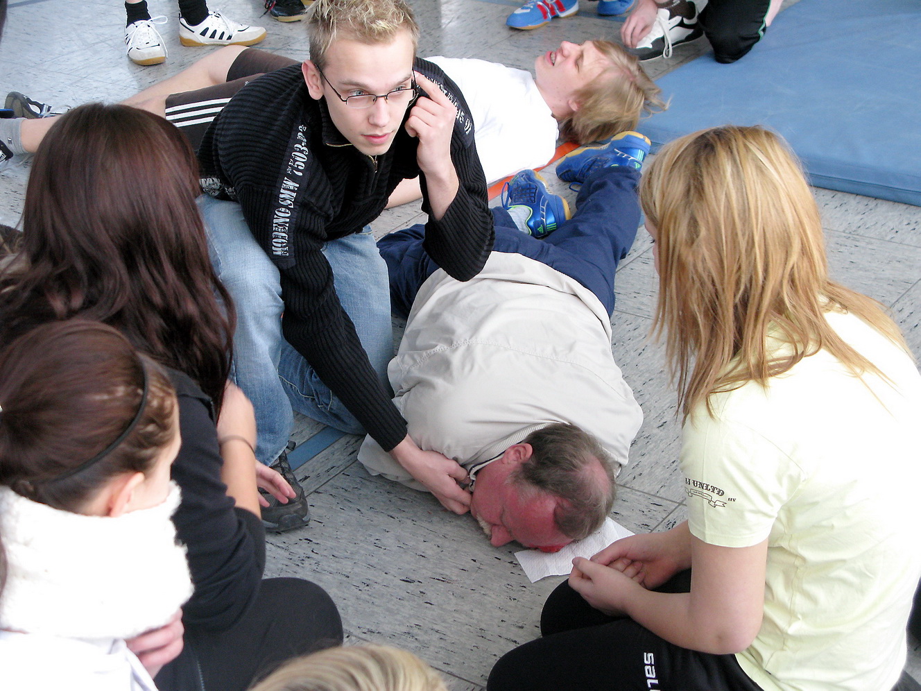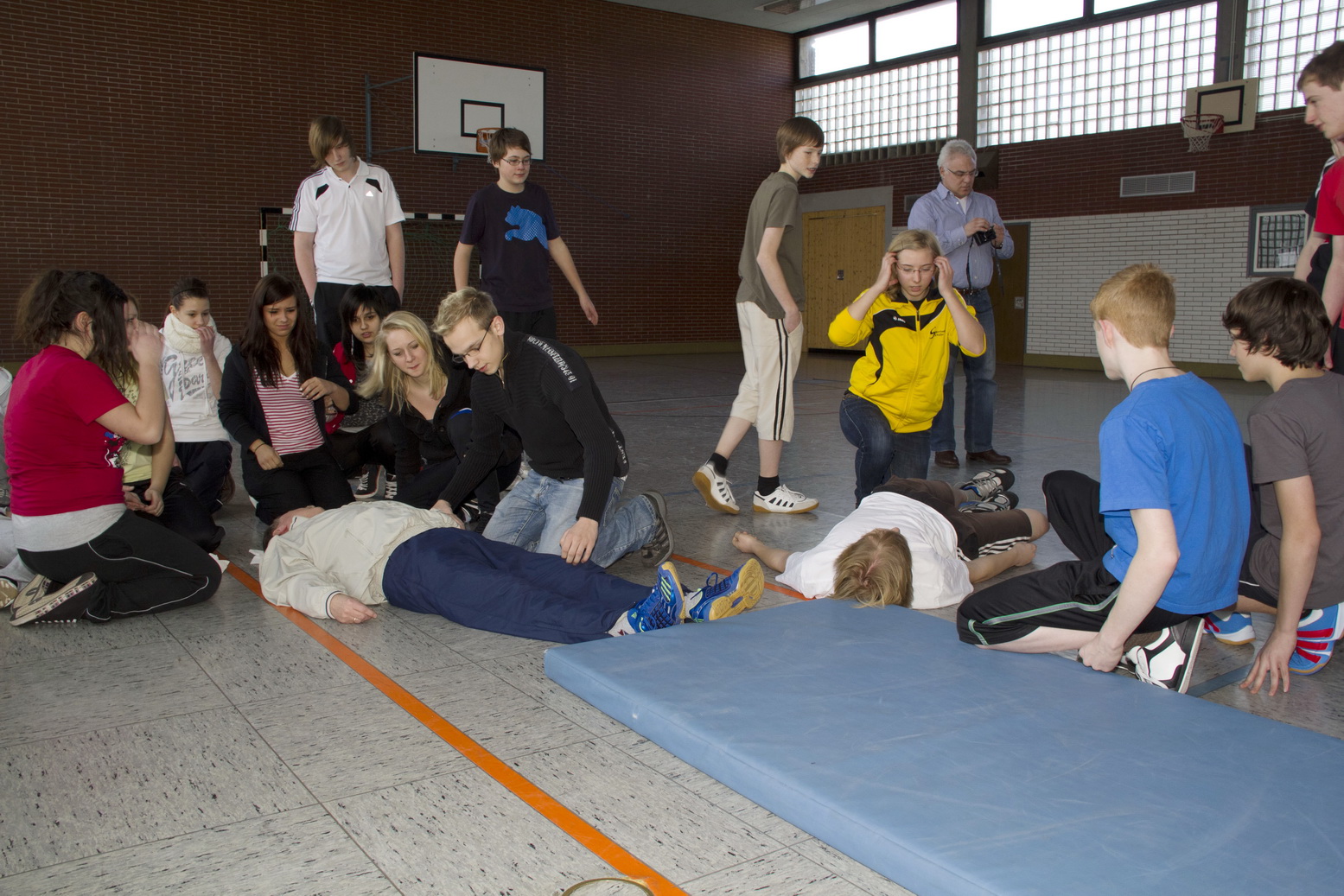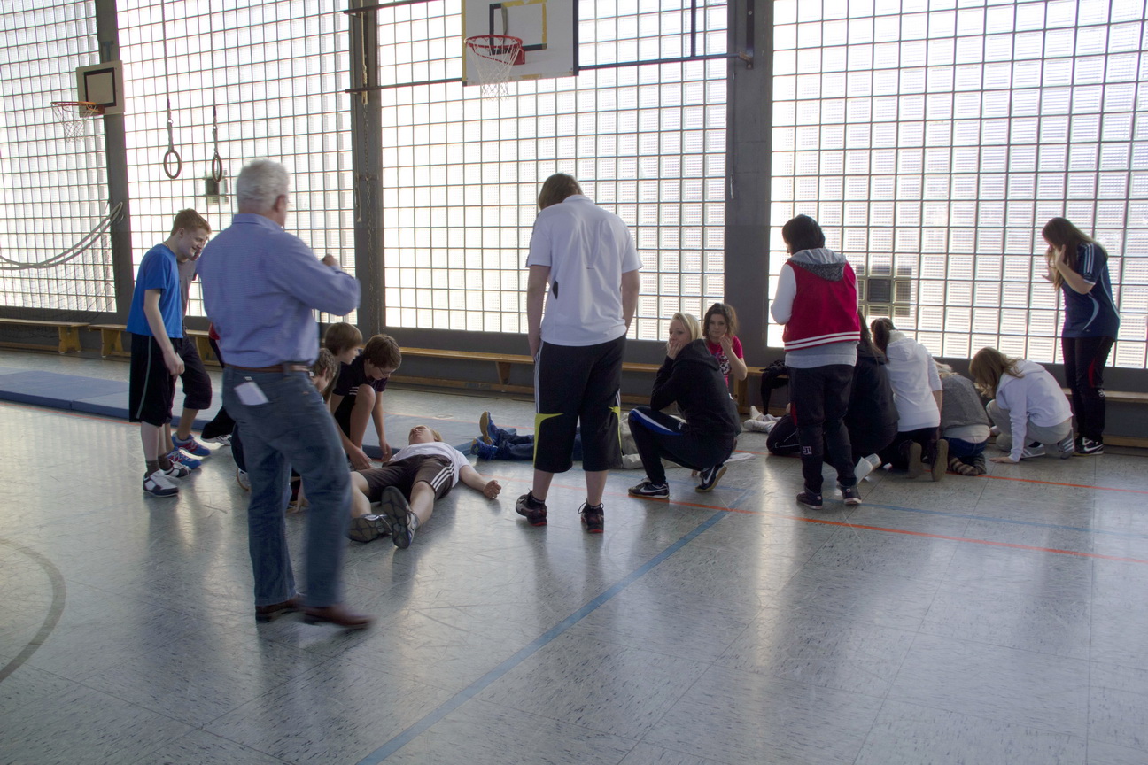 Zuvor, so die weitere Übungssituation, hatte der Schüler bei seinem Sturz den Lehrer so unglücklich am Kopf getroffen, dass dieser, aus einer Platzwunde blutend, bewusstlos zusammengebrochen sei.