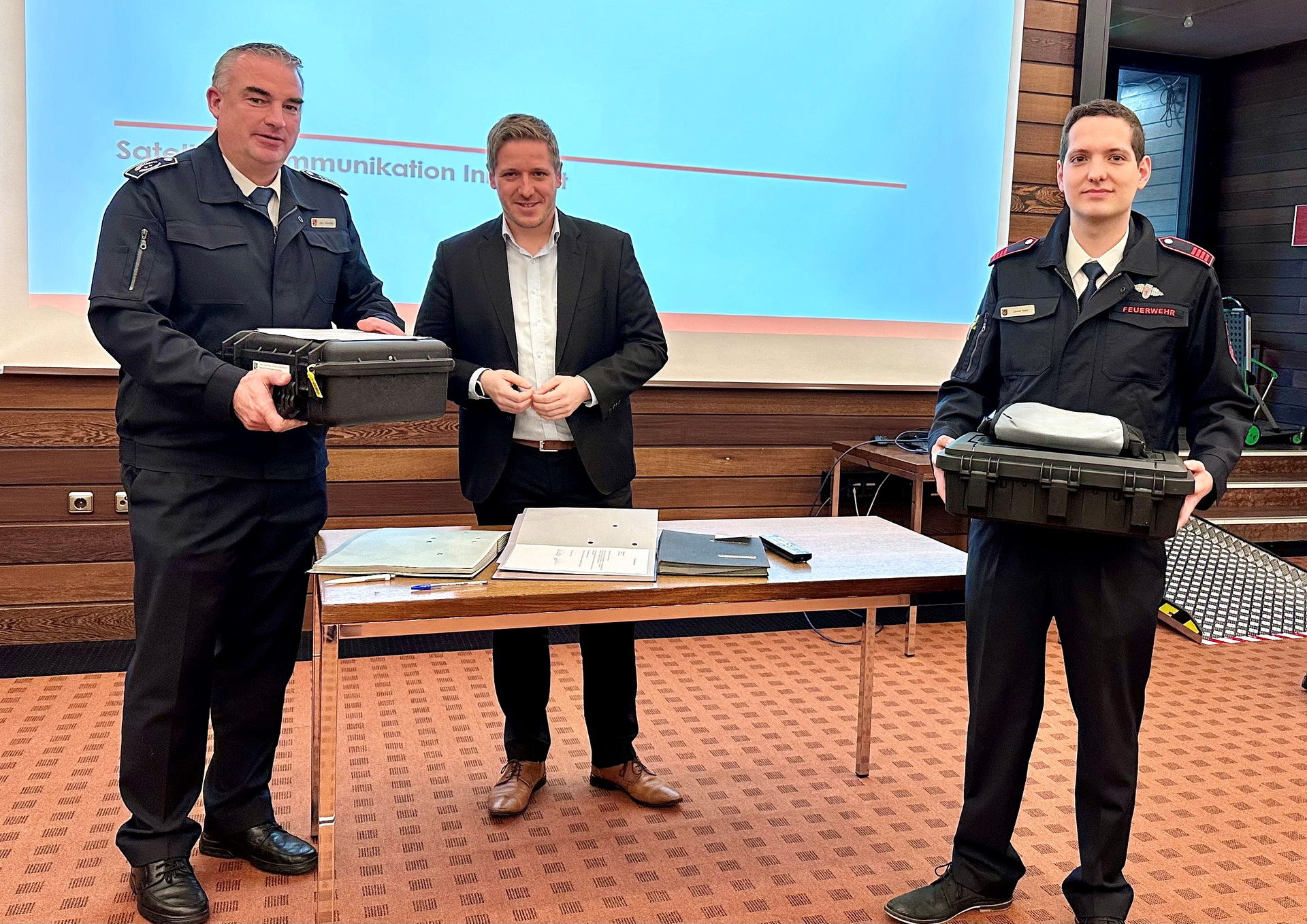 Letzter Baustein im Konzept seien nun die hochmodernen Satellitentelefone auf „Inmarsat“-Basis, die nun ebenfalls an die Städte und Gemeinden sowie an die Hilfsorganisationen DRK, MHD, THW und DLRG sowie die Polizei übergeben wurden. Das Gesamtpaket hat einen Anschaffungswert von rund 100.000 Euro – Geld, das vom Kreistag für den Bevölkerungsschutz einstimmig bewilligt worden war.