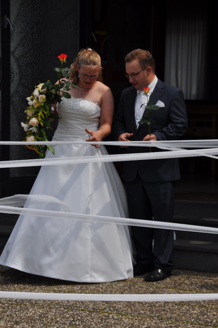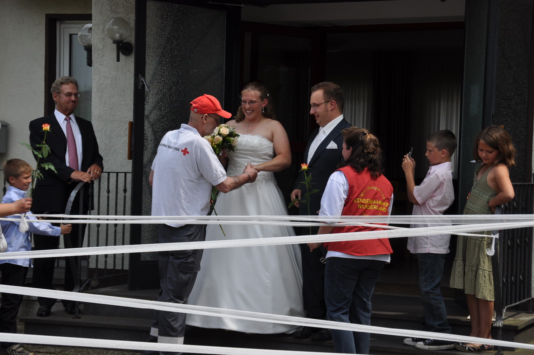 Standesgemäß mussten die beiden sich ihren Weg durch das Ehrenspalier "freischneiden": Die Rotkreuzler hatten den Weg mit Mullbinden versperrt. Direkt im Anschluß galt es, über Feuerwehrschläuche zu schreiten.