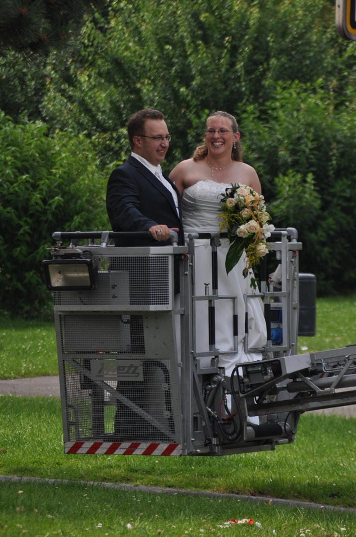 Einer der Höhepunkte für das neue Brautpaar dürfte sicherlich der Ausblick auf die Römerstadt aus gut 25 Metern Höhe gewesen sein. Denn die Kameraden der Feuerwehr luden sie zur Ausfahrt mit der Drehleiter durch die Römerstadt ein - unter dem Beifall der Hochzeitsgäste ging es für die beiden zum ersten Mal hoch hinaus.