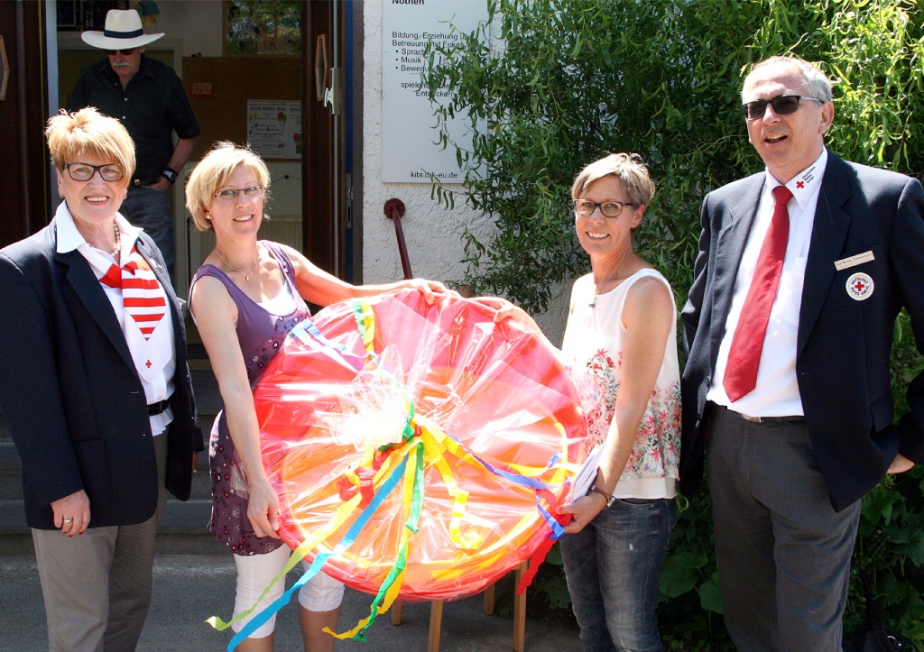 Ein ungleich größeres Geschenk hatte die Elternratsvorsitzende Anja August mitgebracht: Im Namen der „Rokki“-Eltern schenkte sie Irene Müller einen Riesenkreisel. Auch Christoph Ohlert und Guido Mombach, die am Grill für das leibliche Wohl der Gäste sorgten, gehören dazu. „Rokki“-Vater Ohlert begründete, warum die beiden Kinder der Familie in Nöthen sind: „Wir wohnen in Holzheim, da wäre der Kindergarten in Harzheim genauso weit entfernt. Wir haben uns für Nöthen entschieden, weil der Rotkreuzkindergarten einen guten Ruf hat.“