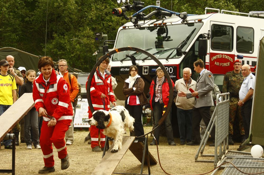 Aus dem Kreis Euskirchen unterstützten Kräfte der Rotkreuz-Rettungshundestaffel Kall ihre Kollegen aus Alzey und Kirchheimbolanden, die erstmalig gemeinsam auf dem Messegelände mit drei Vorführungen Informationen und Einblicke in die Aufgaben und Tätigkeiten der Suchhunde gaben.