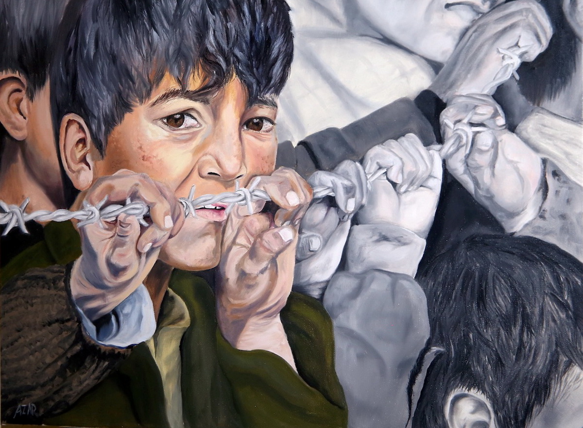 Schleiden-Vogelsang – Es sind Bilder, die im Gedächtnis bleiben. Ungeschönt hat die iranische Malerin Azar Esmaili Bilder gemalt, auf denen die Leiden der Flucht und die Verzweiflung in den Flüchtlingslagern gezeigt werden. Mit einer Mischung aus fotorealistischer Detailliebe und surrealistischer Gestaltungskraft mischt sie die sattsam bekannten Bilder der Angst und Hoffnungslosigkeit mit Drama und Gewalt. Und so waren sich die Besucher bei der Eröffnung der Ausstellung „Frieden, Flucht und Menschlichkeit“ im Rotkreuzmuseum in Vogelsang einig, dass Esmaili einen besonderen Beitrag geliefert habe.