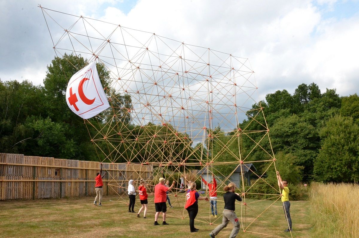 Gleich mehrere Projekte setzten die Jugendlichen und jungen Erwachsenen gemeinsam im Außen- und Innenbereich der Anlage um: Einen neuen Escape-Room und den „Tunnel of Visions“ (zu Deutsch: „Tunnel der Visionen“). Zusätzlich fertigten sie gemeinsam eine große, hölzerne Pyramide, die aus vielen Dreiecken zusammengesetzt wurde, an – mit wehendem, rotem Kreuz und rotem Halbmond an der hohen Spitze.