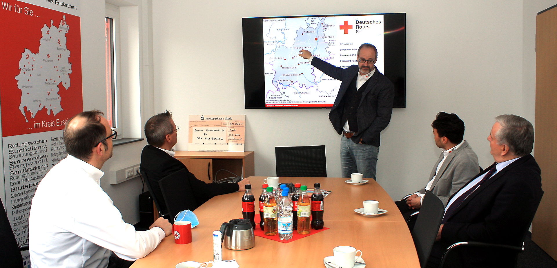Für die Spendenübergabe waren die Vertreter des DRK-Kreisverbandes eigens aus Stade angereist, um sich auch vor Ort ein Bild von den hochwasserbetroffenen Mitgliedern der Rotkreuz-Familie zu machen. Gunter Armonat, Präsident des Stadener Kreisverbandes, betonte: „Wir wussten schon vorher, dass Sie mit unserer Spende etwas Gutes machen würden.“ Der Kreisverband hatte nach dem Hochwasser in seinem Verbandsgebiet um Spenden gebeten und unterstützt damit nun die pädagogische Betreuung der Kinder in den Übergangs-Containern und später im neuen Kita-Gebäude in Gemünd.