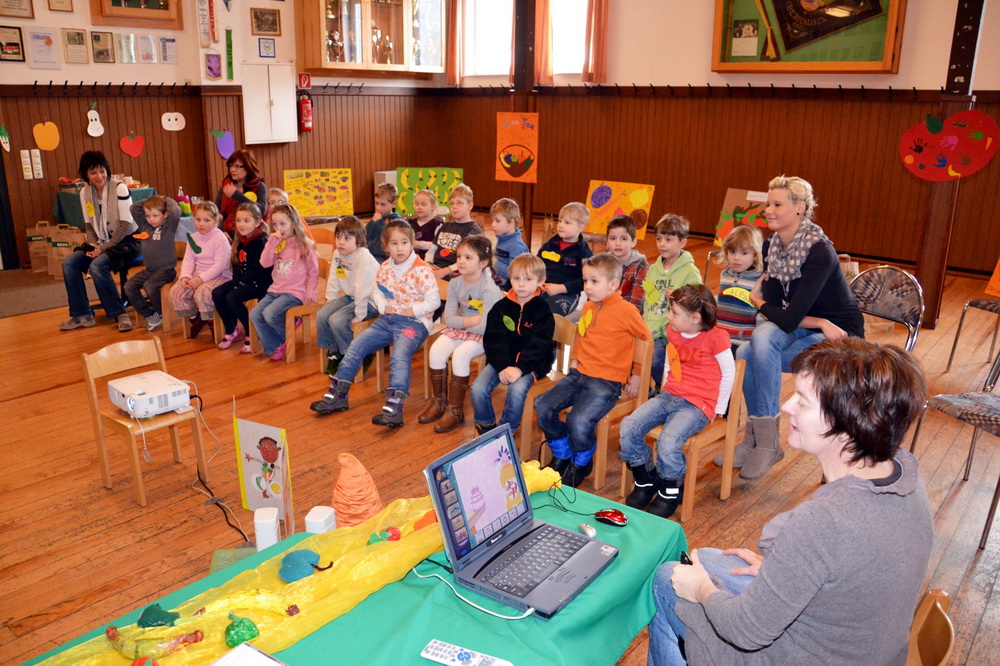 Generell ist es das Hauptanliegen des AKNM, dem falschen und überzogenen Mediengebrauch und insbesondere der daraus resultierenden Vereinsamung vorzubeugen. Die Kindergartenkinder wurden folglich nicht einfach nur mit Spielen am Computer beschäftigt; der Frühförderworkshop zielte vielmehr auch auf das gesunde Leben jenseits des Computers ab. Und gerade in diesem Bereich konnten die Vorschulkinder aus Oberhausen, Herhahn und Gemünd ordentlich Punkte sammeln: In der aufgebauten Obst- und Gemüseabteilung fanden sich alle bestens zurecht.