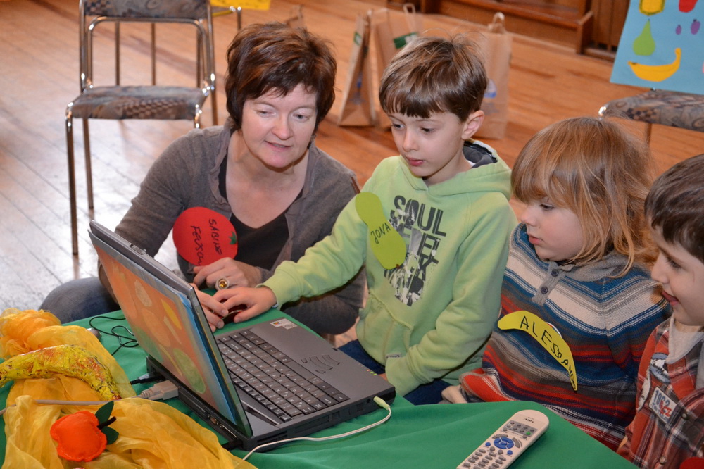 Das aktuelle Frühförderprojekt kombiniert zwei für die kommenden Schulkinder ganz wichtige Themen: Gesunde Ernährung und altersgerechte Medienkompetenz. „Wir möchten den Kindern zeigen und erlebbar für sie machen, dass die Arbeit mit dem PC in der Gruppe kommunikativlebendig, lehrreich und Freude bringend sein kann“, so Sabine Fewson. Mit Hilfe von Laptop, Maus und Beamer erarbeiteten die Kinder auf spielerische Art und Weise die Gesundheitszauberformel „5 am Tag“. Bewegungsspiele, Tänze und Lieder rundeten den Workshop ab. Zwischendurch gab’s immer wieder kleine Stärkungen in Form von Möhren-Sticks, Mandarinen, Apfelspalten oder Gurkenscheiben.