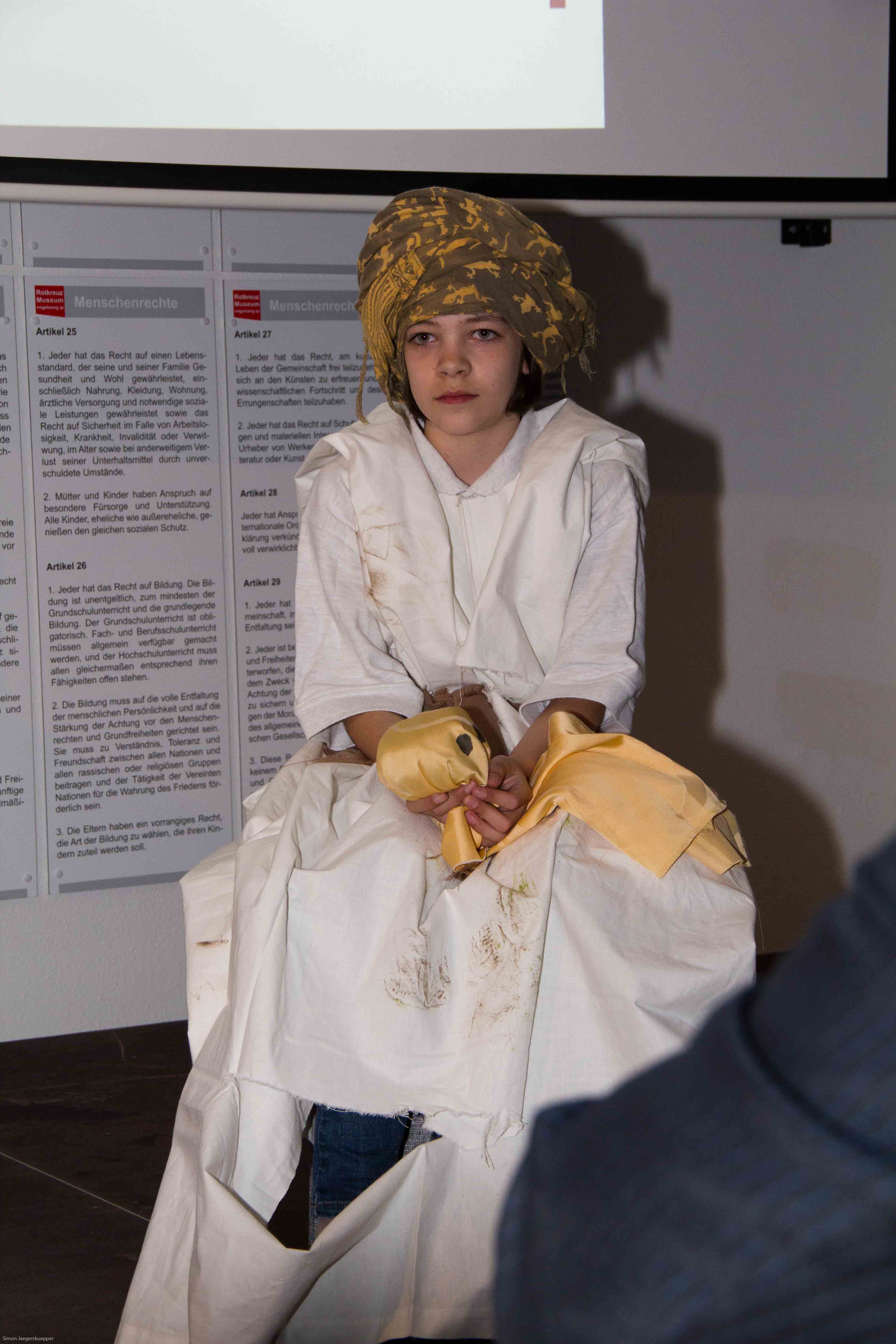 Das Jugendrotkreuz schließlich brachte wie schon bei der Museumseröffnung 2011 eine bewegende symbolische Inszenierung auf die Bühne, die das ganze humanitäre Anliegen der Rotkreuzbewegung auf den Punkt brachte: Jugendrotkreuzler brachten überflüssige Nahrungsmittel und Getränke, Spielsachen und Kuscheltiere, aber auch, symbolisiert durch Bücher und Hefte, Bildung über eine mehr und mehr abgetragene Mauer von den Kindern der reichen Welt zu denen auf der anderen, der unterprivilegierten Seite.