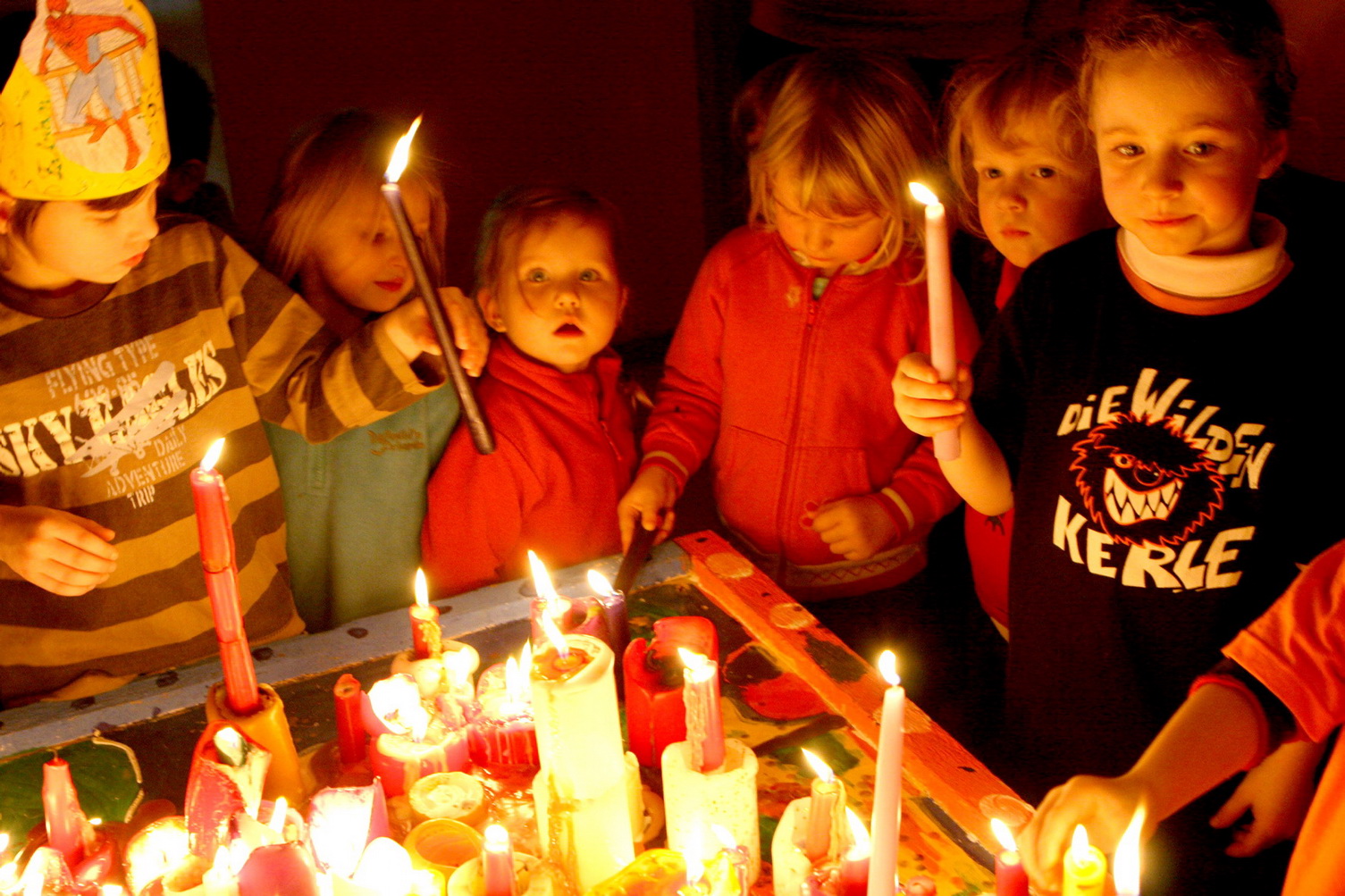 Mit viel Freude bauten die Kinder aus den Kerzen kunstvoll leuchtende Bauwerke und beobachteten fasziniert, wie der kunterbunte Wachsfluss sich seine Wege suchte. Mit leckerem Tee und vielen Süßigkeiten wurde bei guter Laune und Musik mit viel Eifer gespielt.