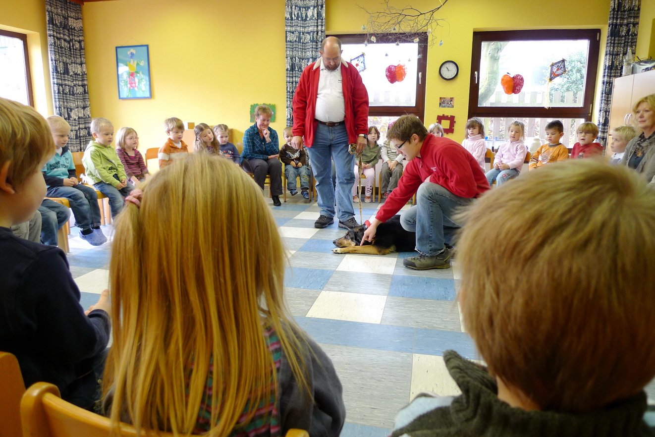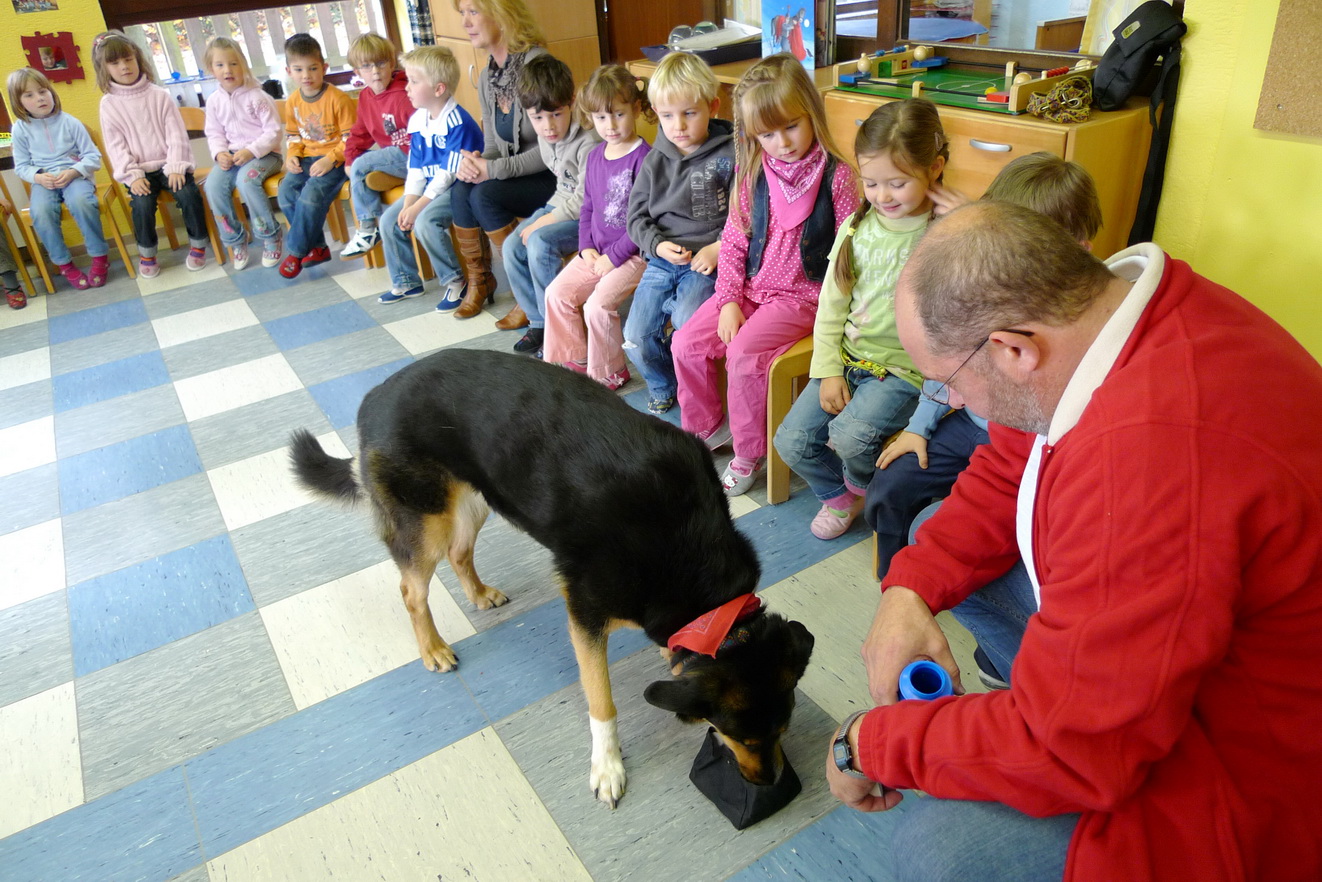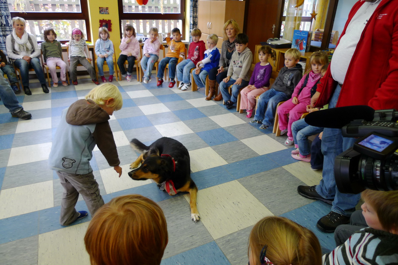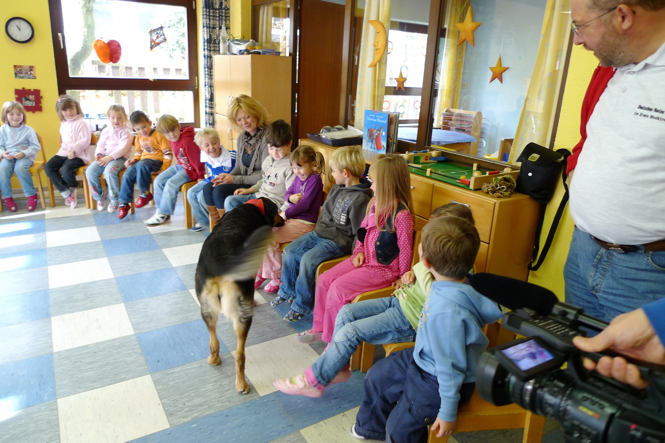 Der "Besuchshundedienst" ist ein neues Projekt der Rotkreuz-Rettungshundesaffel aus Kall. Unterstützt von der "Aktion Mensch" stellt Franz Küpper, Leiter der Rettungshundestaffel, ein Team von Freiwilligen zusammen, die ehrenamtlich mit ihren braven Vierbeinern Menschen in Alten- oder Pflegeheimen besuchen. Oder wie hier in der Kindertagesstätte Dreiborn...