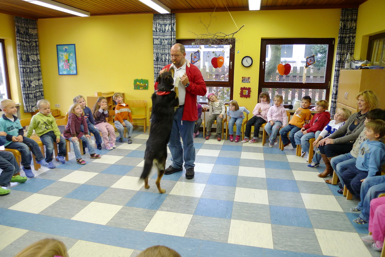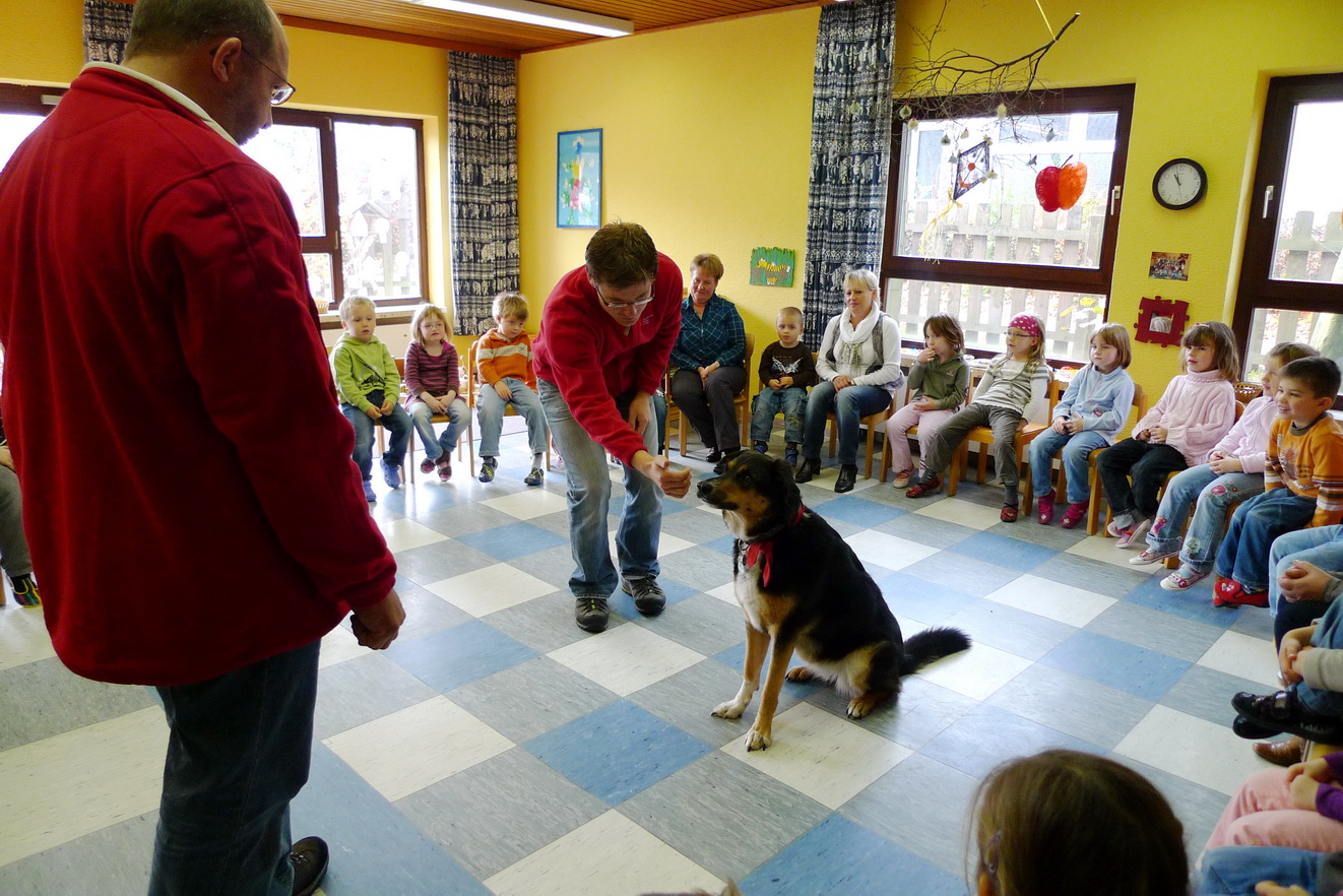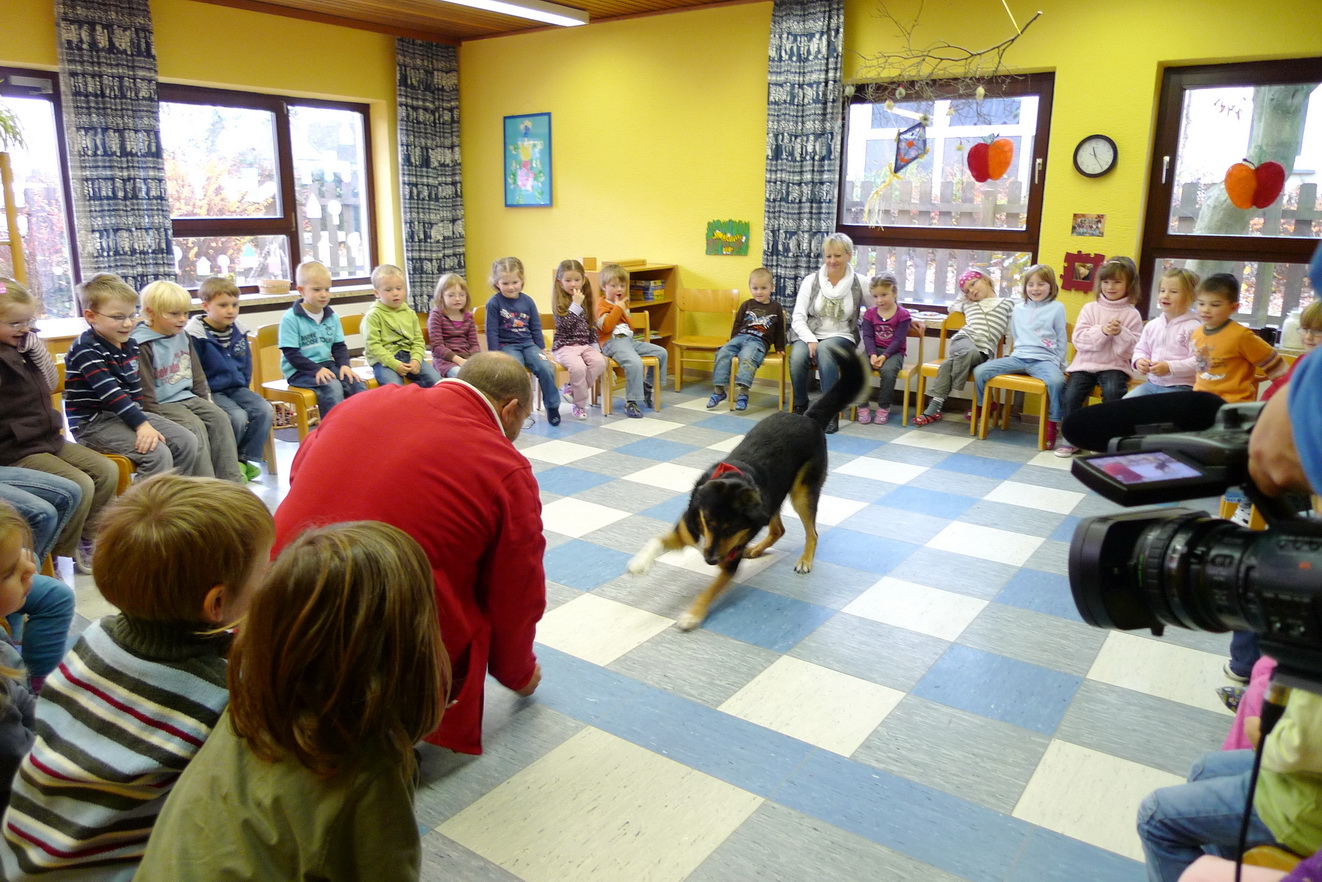 Der "Besuchshundedienst" ist ein neues Projekt der Rotkreuz-Rettungshundesaffel aus Kall. Unterstützt von der "Aktion Mensch" stellt Franz Küpper, Leiter der Rettungshundestaffel, ein Team von Freiwilligen zusammen, die ehrenamtlich mit ihren braven Vierbeinern Menschen in Alten- oder Pflegeheimen besuchen. Oder wie hier in der Kindertagesstätte Dreiborn...