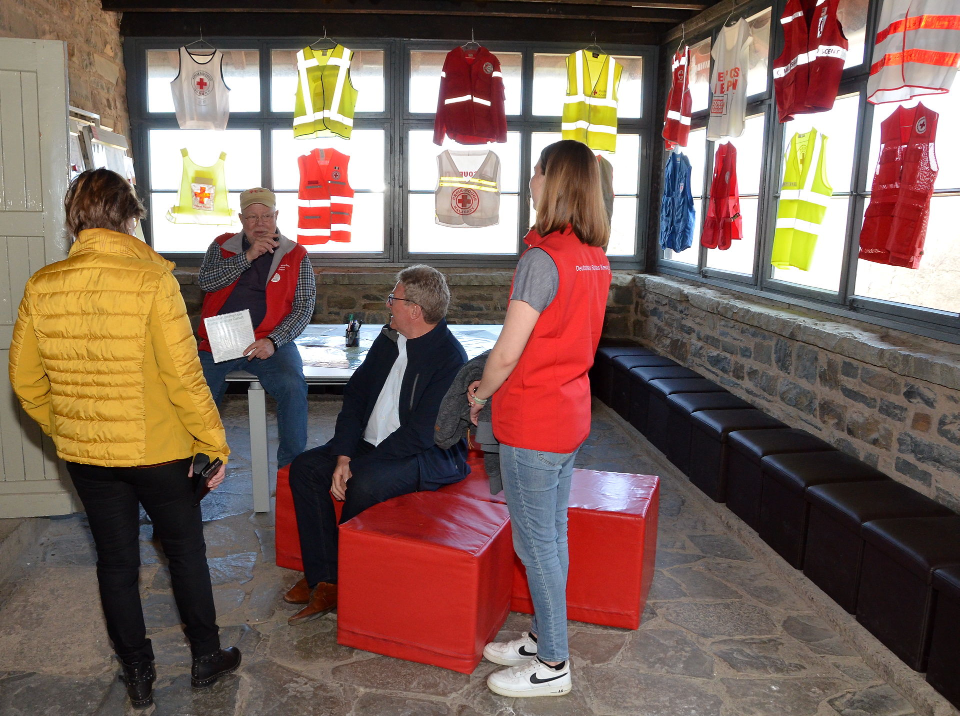 Rolf Zimmermann, Vorsitzender des DRK Ortsverbandes Schleiden und Rotkreuz-Museumschef in Vogelsang und Maria Steffen, ebenfalls aus dem Vorstand, begleiteten ihren Besuch. Hier tauschten sich Besucher und Rotkreuzler auch mit den teilnehmenden Schülerinnen und Schülern vom Clara-Fey-Gymnasium in Schleiden aus. Maria Steffen bemerkte im Vorfeld: „Leider konnten von den ursprünglich 21 angemeldeten Schülerinnen und Schülern nur 14 erschienen, da auch hier Corona seine Finger im Spiel hat. Am nächsten Wochenende sollen es dann 16 sein, wenn hoffentlich alles klappt.“