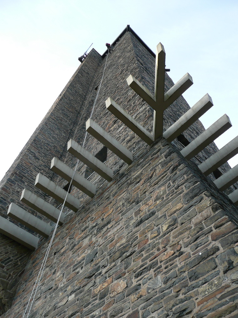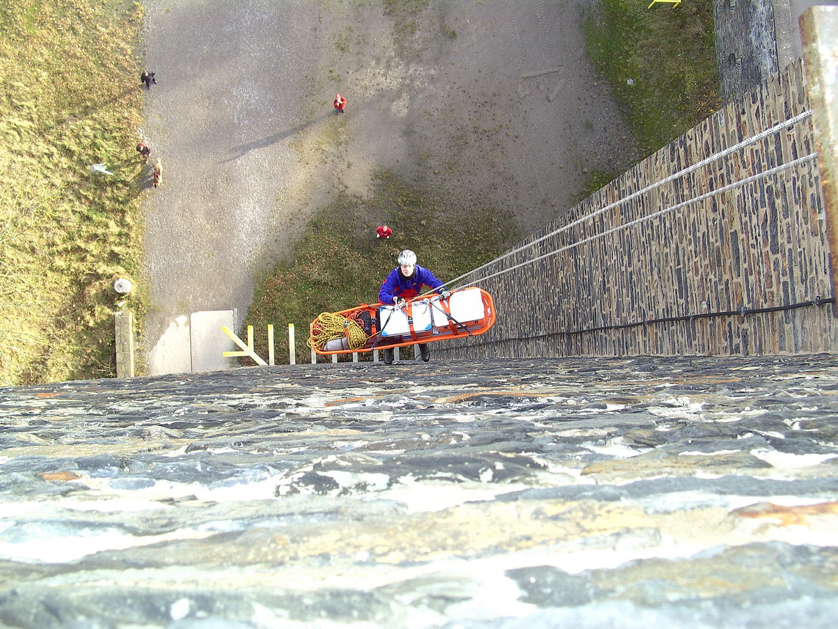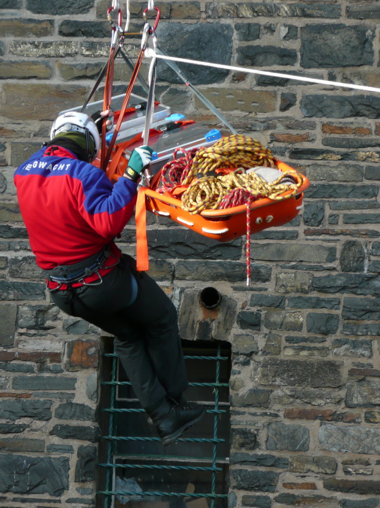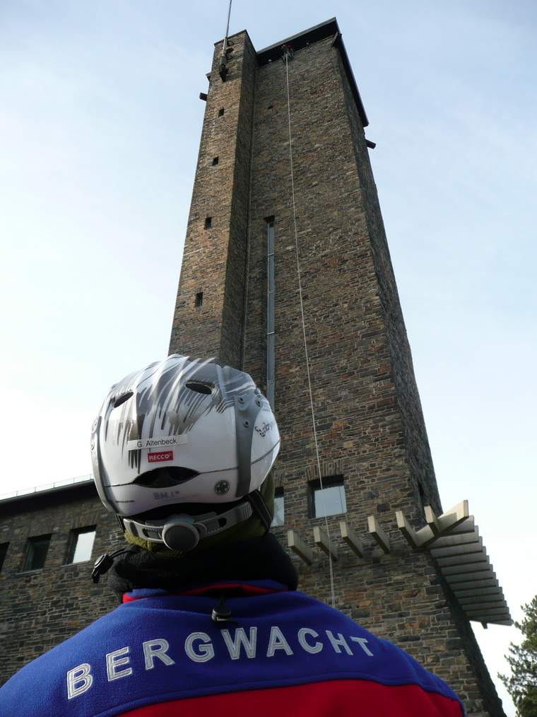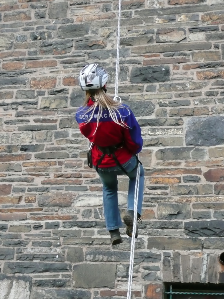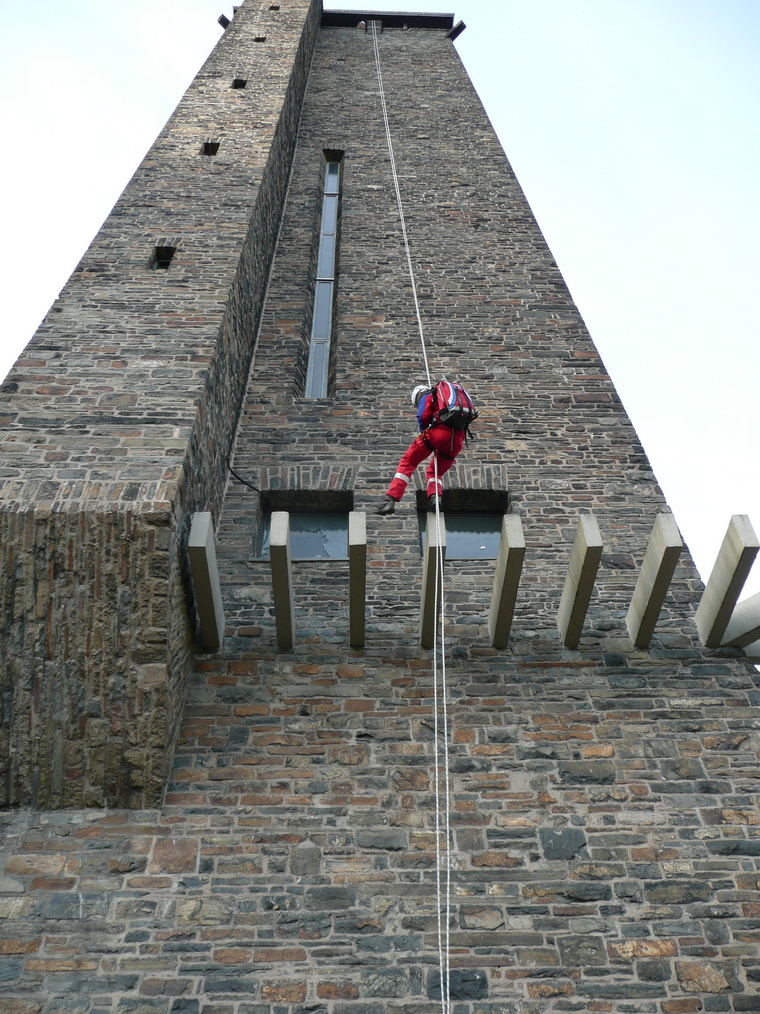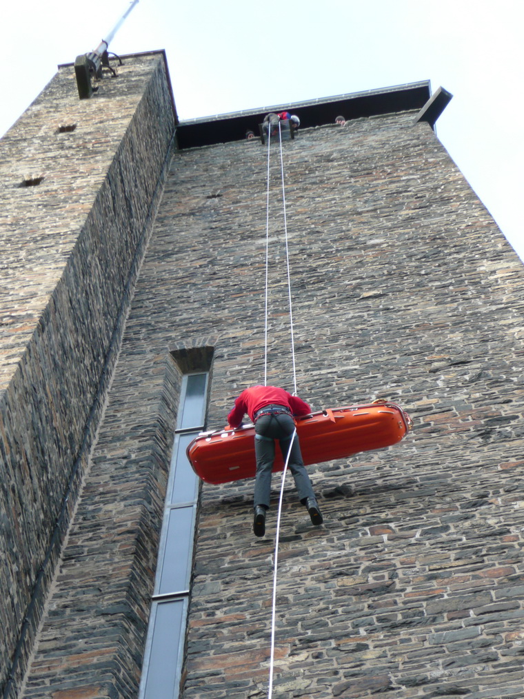 Sicherheit steht immer an erster Stelle. Deshalb übte die Rotkreuz-Bergwacht die Rettung verletzter oder erkrankter Besucher vom Plateau des Turms auf "Burg Vogelsang".