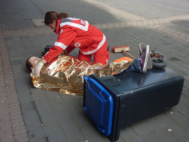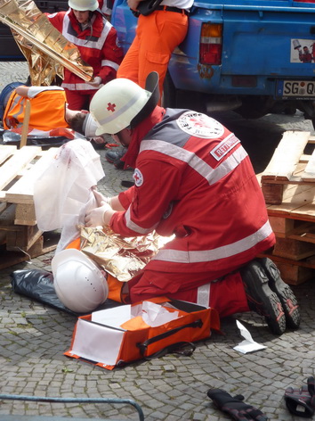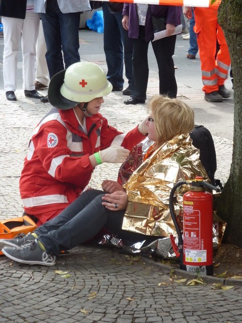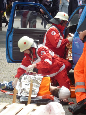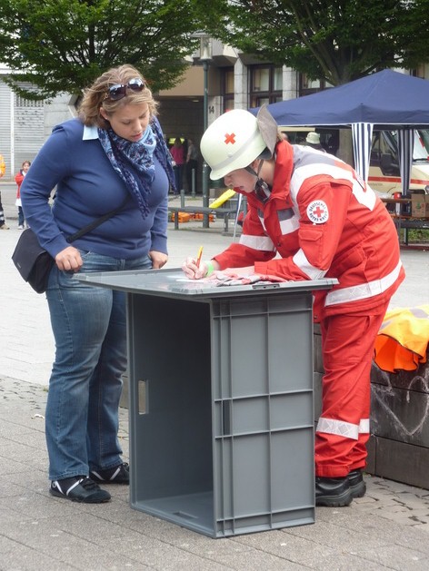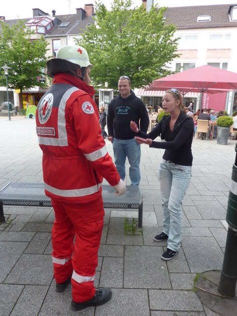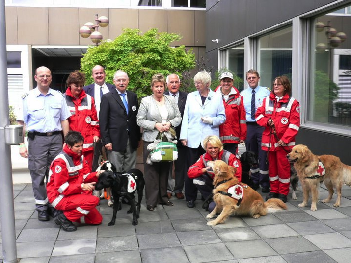 Auf dem Marktplatz von Solingen gab zudem die Rotkreuz-Rettungshundestaffel aus dem Kreis Euskirchen eine Vorführung. Unter den Zuschauern war neben der Bildungsministerin aus NRW, Sylvia Löhrmann, unter anderem auch der Präsident des Rotkreuz Landesverbandes Nordrhein, Herr Hans Schwarz.