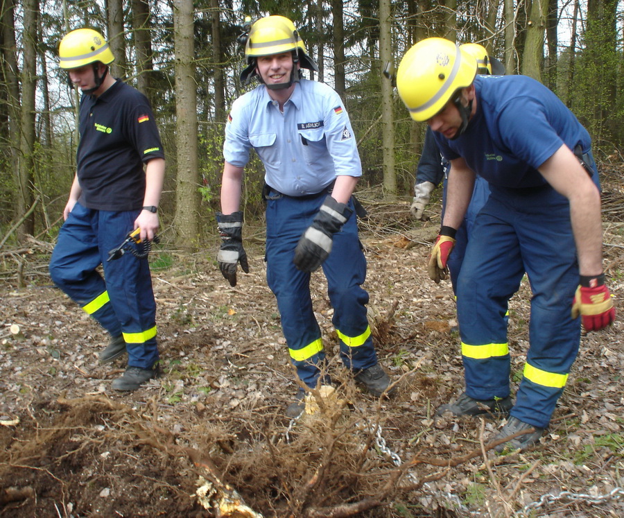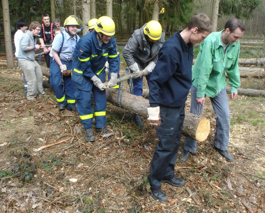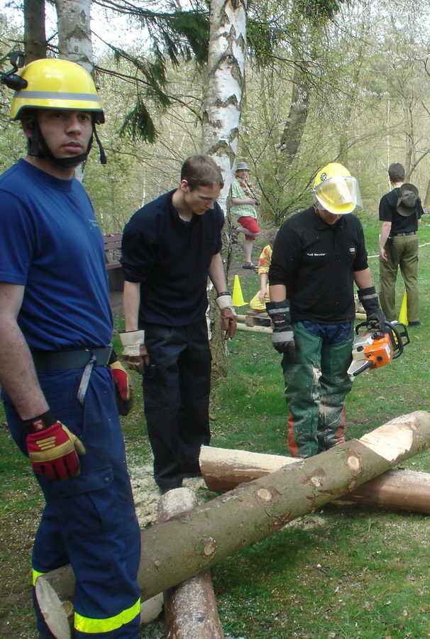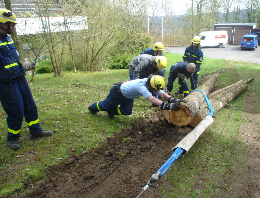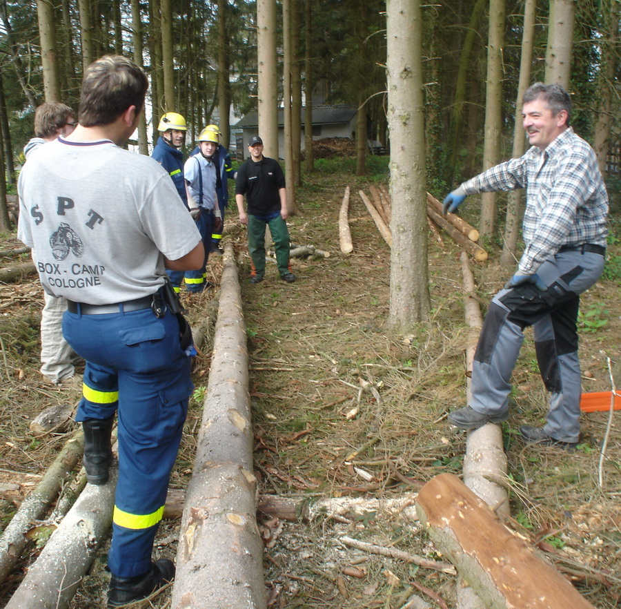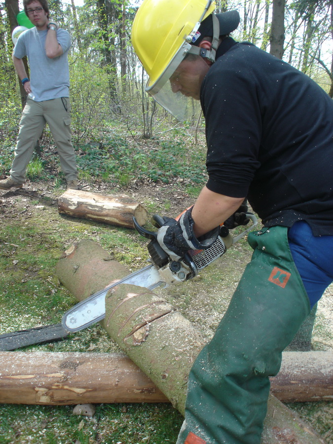 Ein freundlicher Nachbar hatte die mächtigen Fichtenstämme gestiftet, die von den Helfern mit technischer Unterstützung und viel Muskelkraft an die richtigen Stellen gebracht wurden. Das Gelände wurde von den Einsatzkäften des THW geräumt, Wurzeln entfernt und die Fläche gesäubert. Dann begann das Sägen, Bohren und Schrauben.