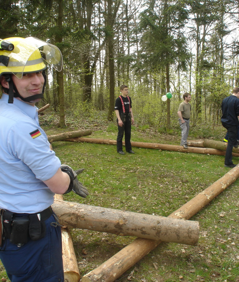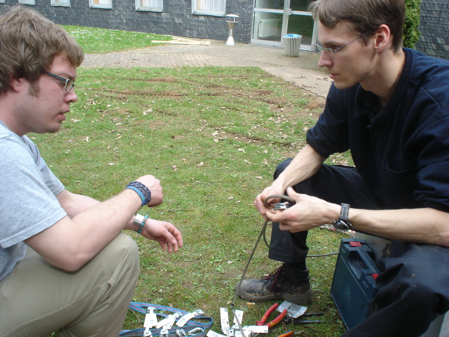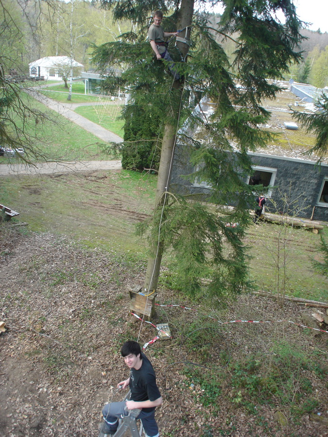 Am Abend war es geschafft. Als erste Stationen waren eine Riesenwippe, ein Teamdreieck und eine Lianenschaukel fertiggestellt. Am ersten Maiwochenende wird das Projektteam um den Rotkreuz FSJ - Teamer (freiwilliges soziales Jahr) Simon Jägersküpper aus Krefeld an einem Übungswochenende die Stationen einweihen.