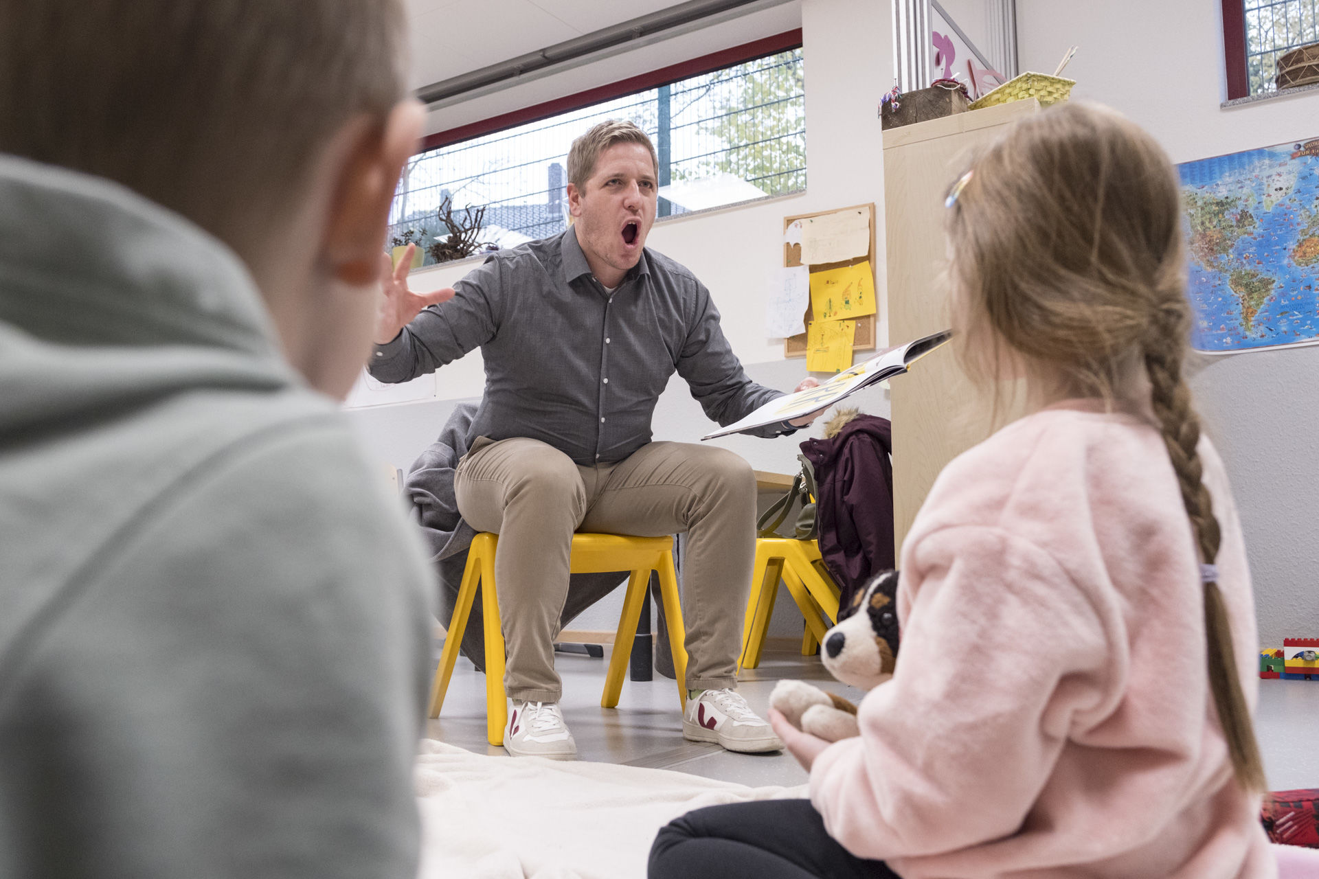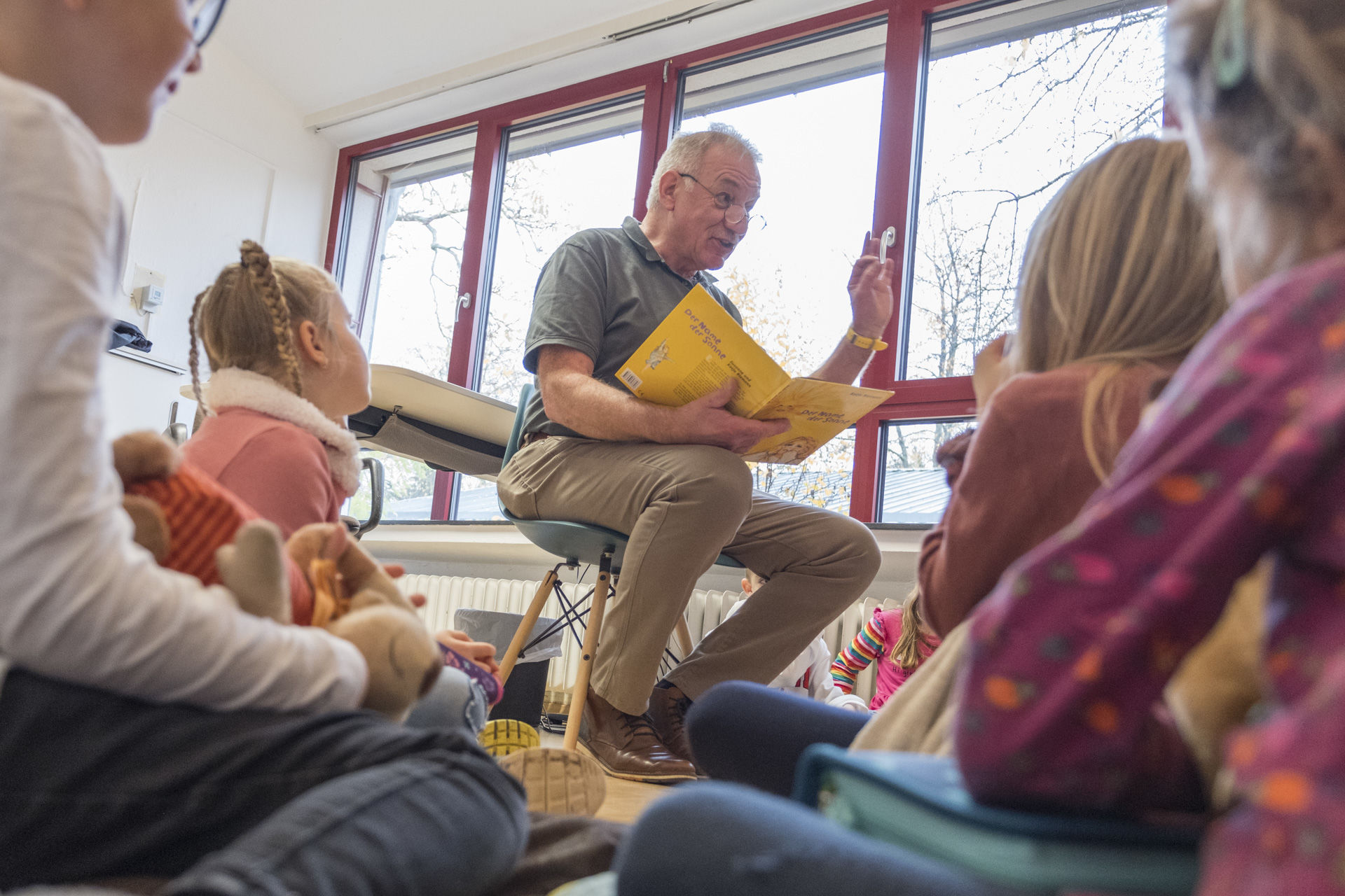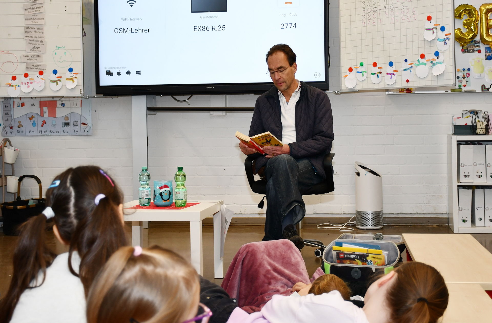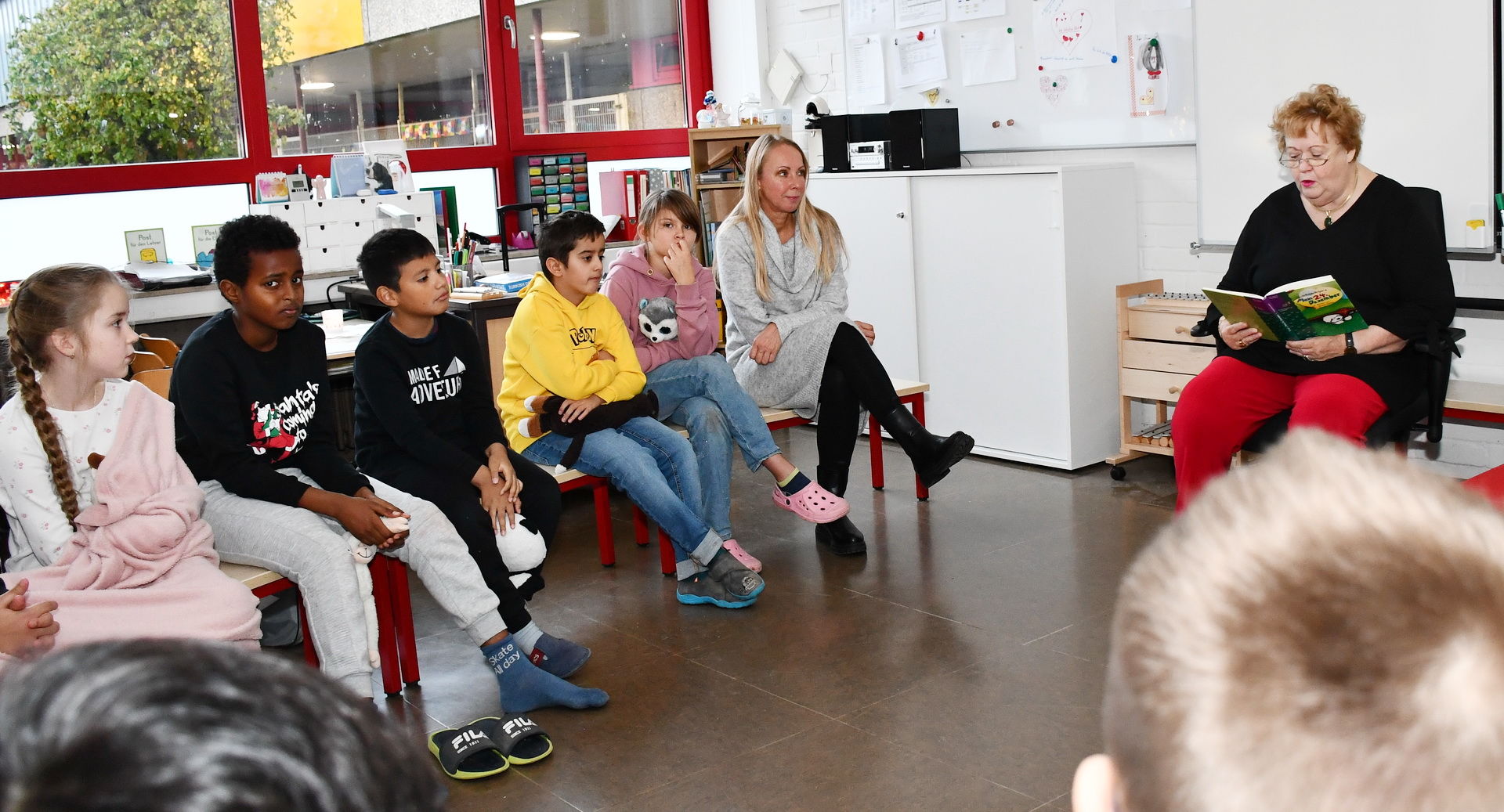 Hoch motiviert waren sie auch am Vorlesetag selbst. Insgesamt 30 Vorlesepaten waren in die Schule gekommen, um den Kindern aus ganz unterschiedlichen Büchern vorzulesen. Mit Kissen und Kuscheltieren „bewaffnet“, verteilten sich die Kinder in die Klassen zu den Vorlesern, für die sie sich im Vorfeld entschieden hatten.
