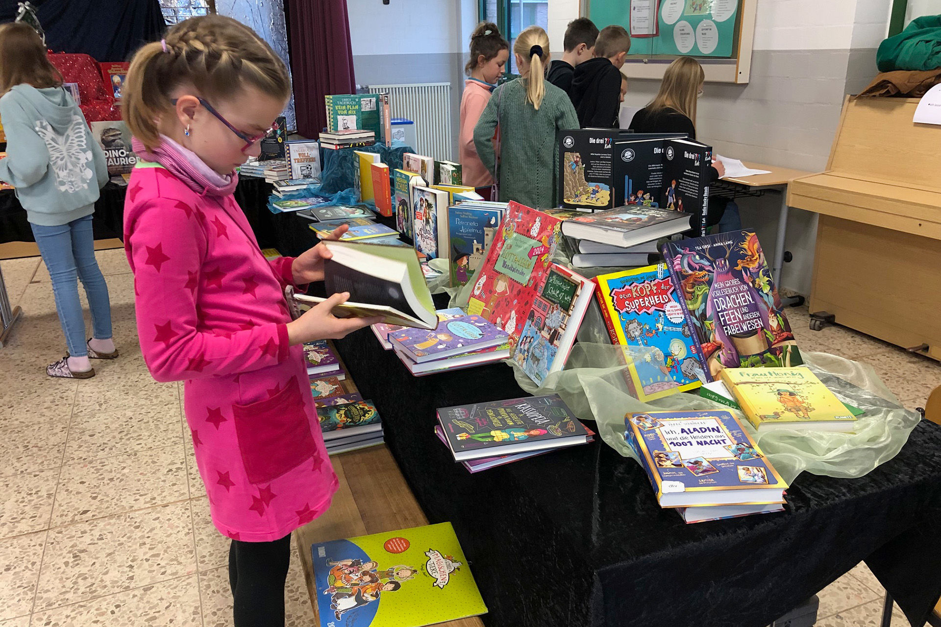 Ein weiteres Highlight in Lückerath ist zudem der Büchermarkt, der von den Büchereifrauen im Foyer aufgebaut wird, Dort können sich die Kinder vormittags und die Eltern von 12 bis 16 Uhr neues Lesefutter, das von der Buchhandlung Feussner zur Verfügung gestellt wird, kaufen. Wie immer gibt es im Büchermarkt den traditionellen Streuselkuchen und Kaffee am Nachmittag.