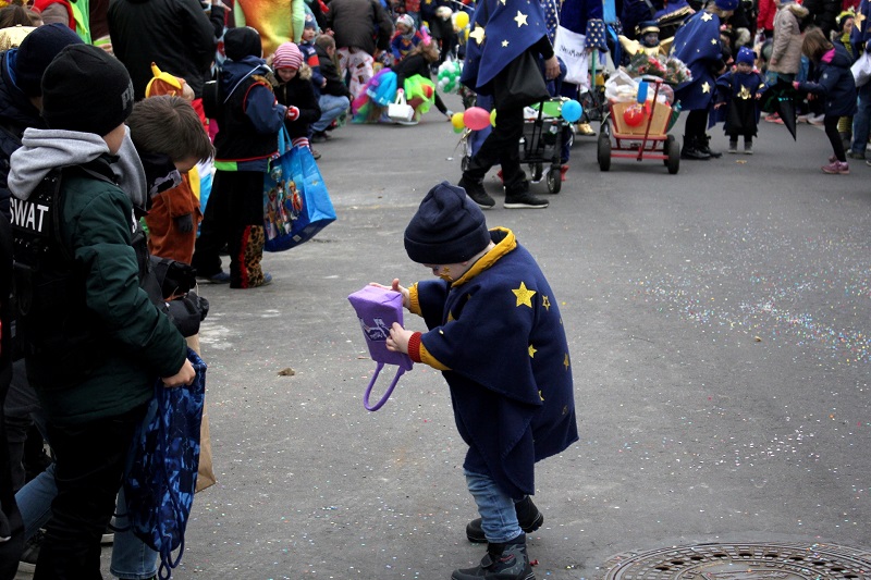 Die jecke Pänz, ihre Eltern und die Kita-Teams machten ordentlich Stimmung und brachten Kamelle unters Volk. Mit Seifenblasen und Konfetti machten sie den wettermäßig grauen Tag auch etwas bunter. Und für die Gesundheit taten die Kitas auch noch etwas: In ihrem Materialwagen, der mitten in der Gruppe fuhr und an dem auch das Motto prangte, hatten sie 1000 Äpfel gestapelt, die verteilt werden mussten.