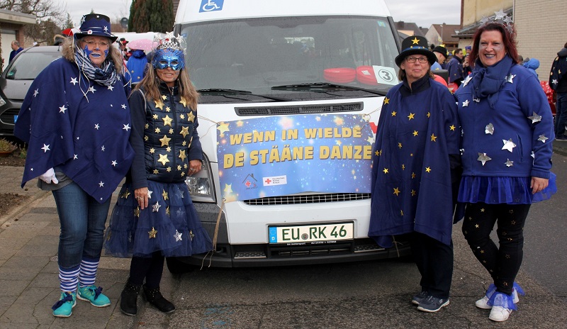 Manche DRK-Jecke hatte noch Accessoires dabei, etwa Haarreife mit Sternen, auch Hüte und Mützen wurden mit Sternen bestickt. Ein Kind war sogar komplett als Stern verkleidet. Und nicht nur das: Ein Mercedes-Stern an einem der Bollerwagen durfte auch nicht fehlen – nee, wat jeck!