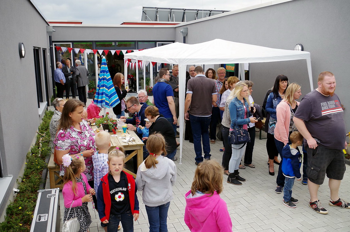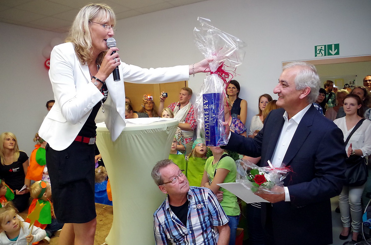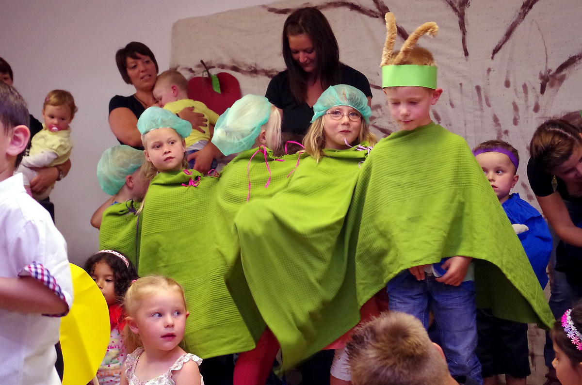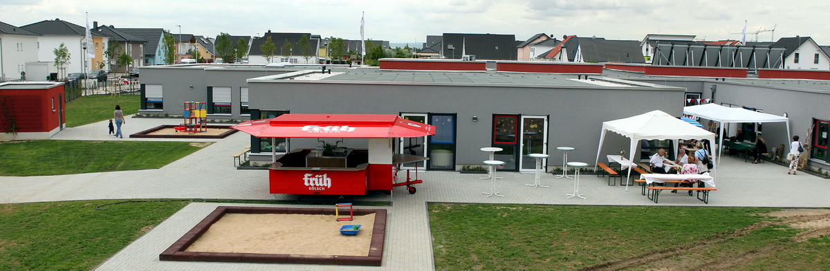 Haus-in-Haus-System macht aus dem vermeintlichen Großkindergarten Weilerswist-Süd mehrere kleinere und übersichtliche Einheiten – Ab dem 1. August werden dort 160 Kinder von 26 Frauen und Männern betreut und versorgt – Einweihungsfeierlichkeiten mit Hunderten Eltern, Offiziellen und Rotkreuzlern - Kinder führten „Die kleine Raupe Nimmersatt“ auf – Architekt Bolliger erklärt Haus-in-Haus-Konzept
