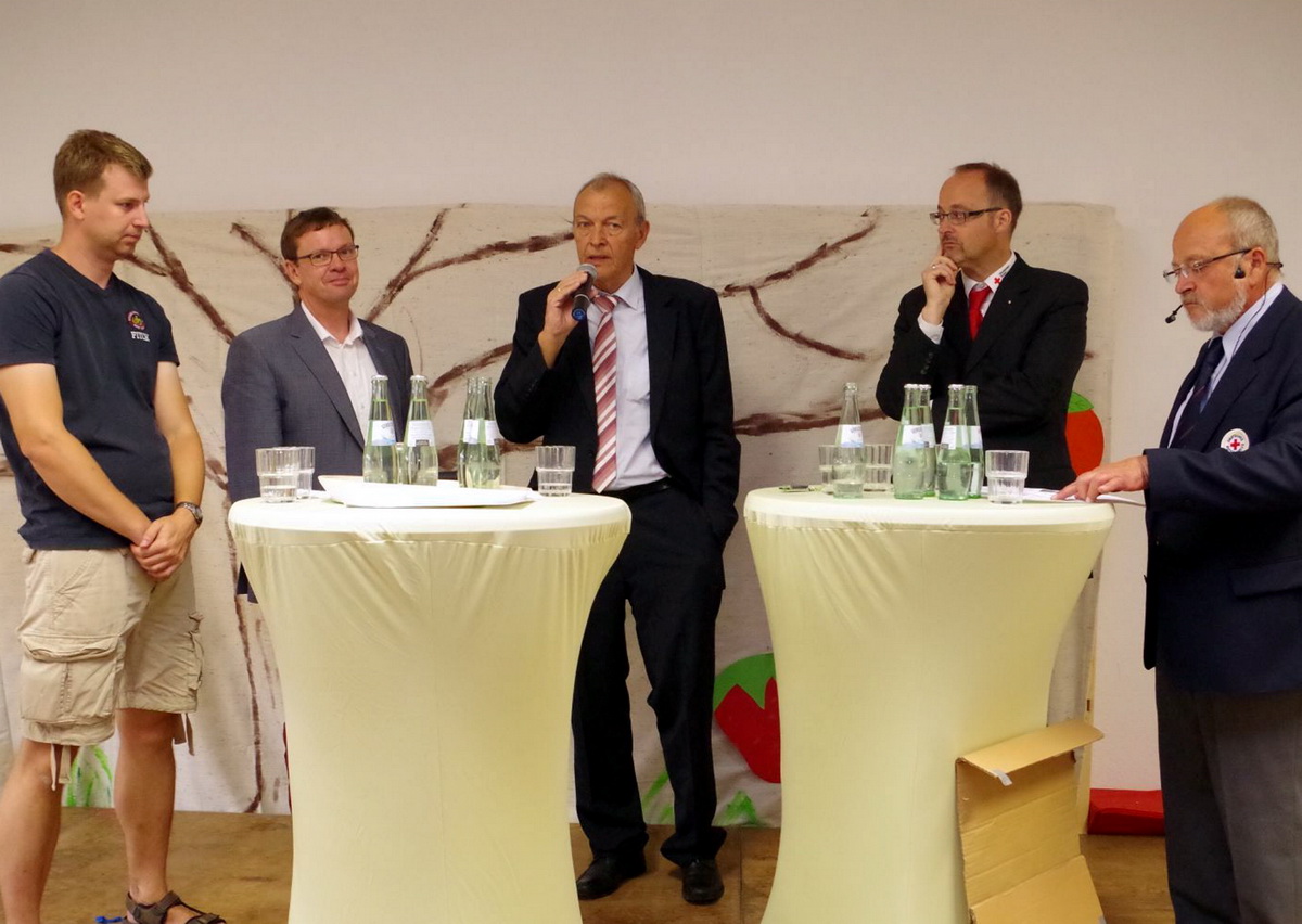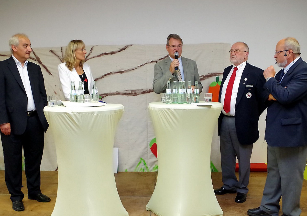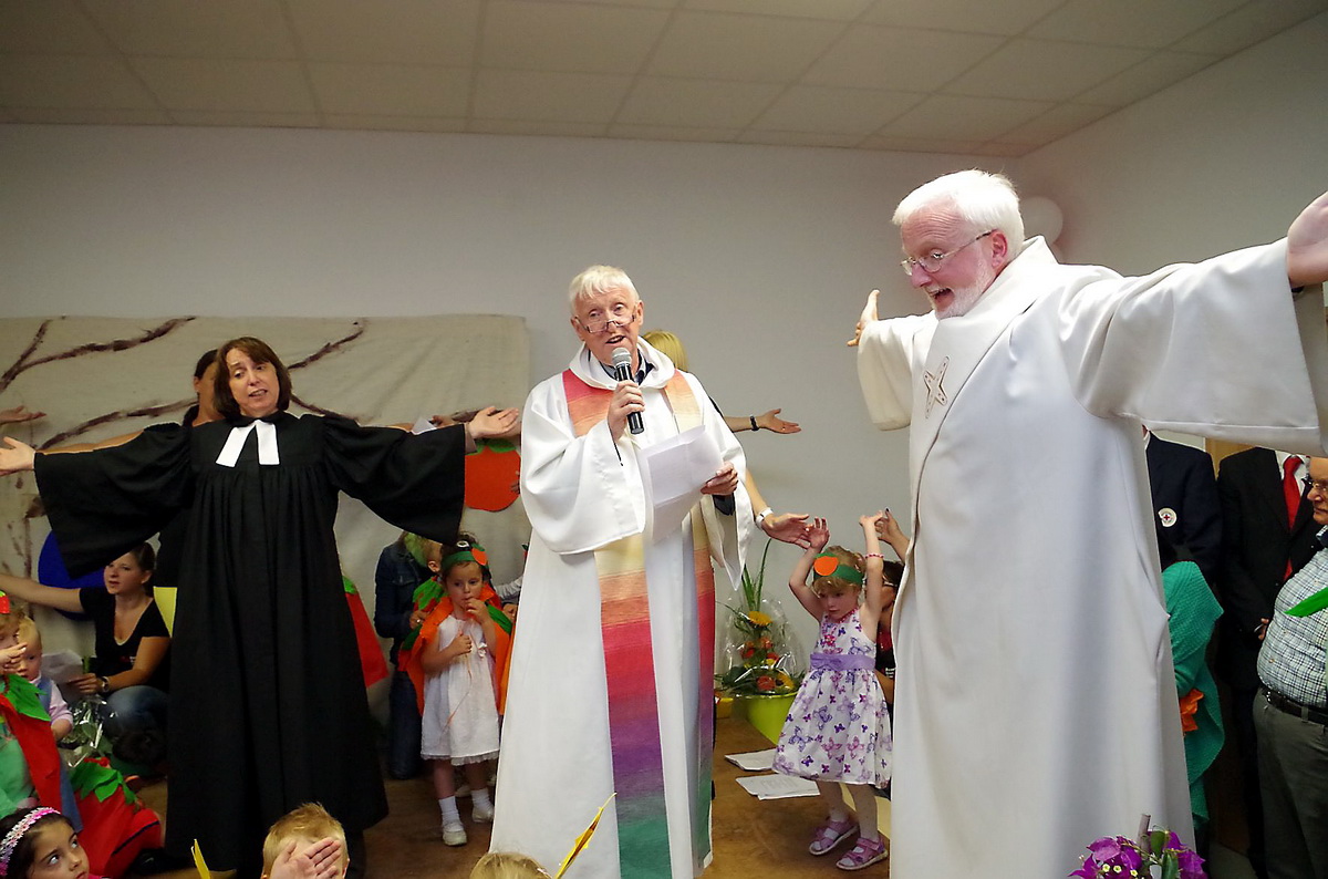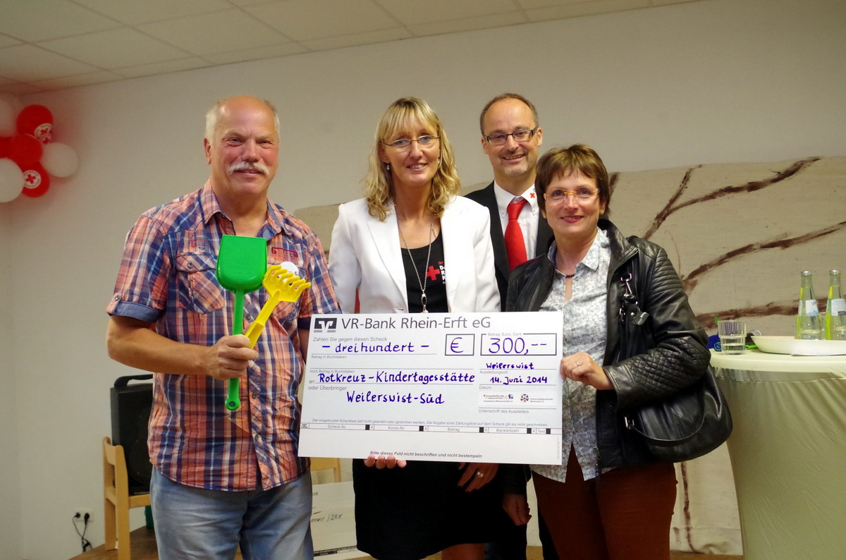 Haus-in-Haus-System macht aus dem vermeintlichen Großkindergarten Weilerswist-Süd mehrere kleinere und übersichtliche Einheiten – Ab dem 1. August werden dort 160 Kinder von 26 Frauen und Männern betreut und versorgt – Einweihungsfeierlichkeiten mit Hunderten Eltern, Offiziellen und Rotkreuzlern - Kinder führten „Die kleine Raupe Nimmersatt“ auf – Architekt Bolliger erklärt Haus-in-Haus-Konzept