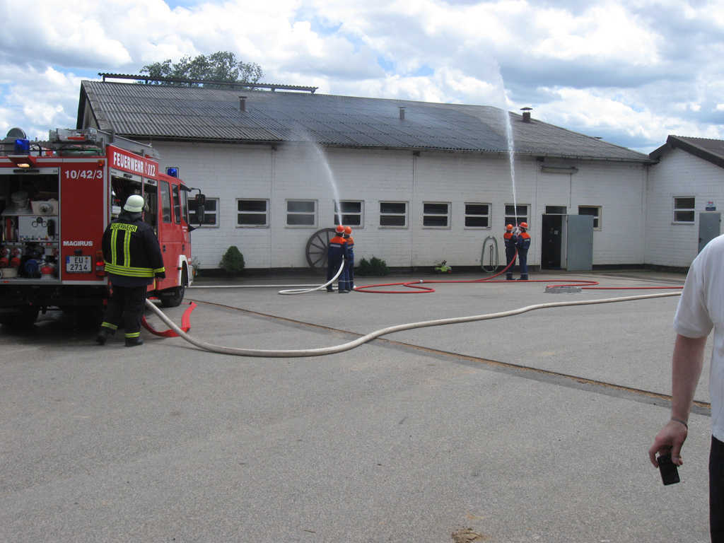 Weilerswist - Am Samstag, den 9.07.2011, stellte Familie Brock uns ihre Scheune für eine Übung gemeinsam mit der Jugendfeuerwehr aus Weilerswist zur Verfügung. Mit 13 JRK´lern und 22 Mitgliedern der JFW inszenierten wir eine Brandlöschung mit Rettung und Erstversorgung von 7 Verletzten.